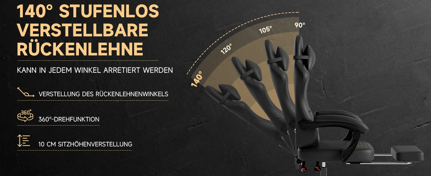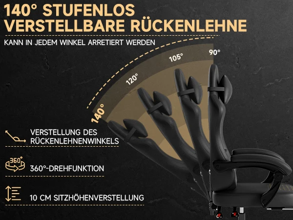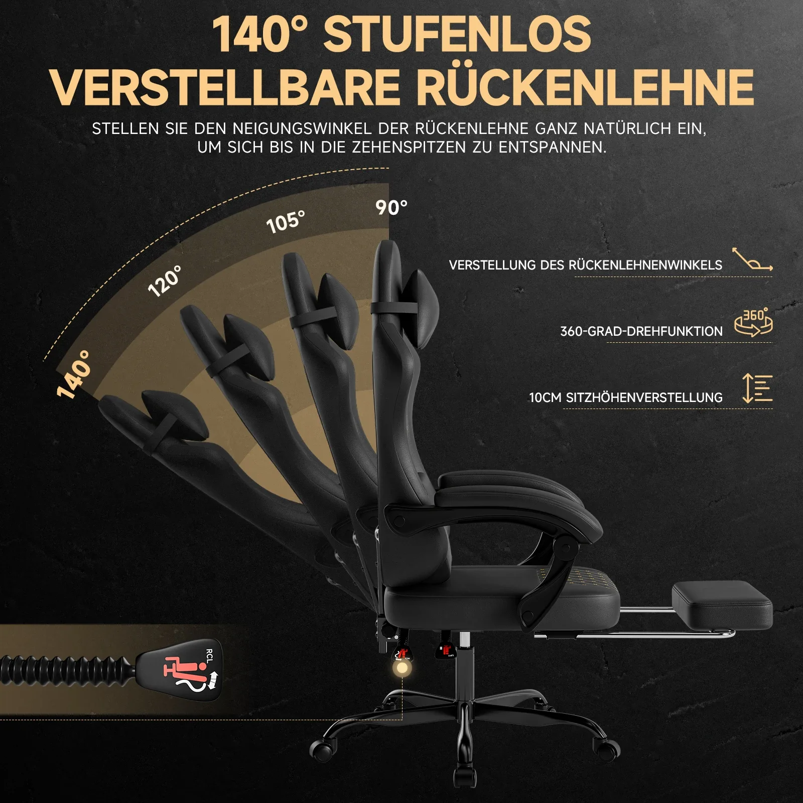 2. Versatile And Adjustable: The gaming chair includes an adjustable headrest, a seat height adjustment range of up to 4 inches, and retractable foot supports to meet the needs of users of different heights. The back of the chair can be adjusted to 90°, 105°, and 135°, so you can find the ideal Angle for work, play, or relaxation. The chair also has silent wheels to make the movement smoother and quieter for the best comfort experience