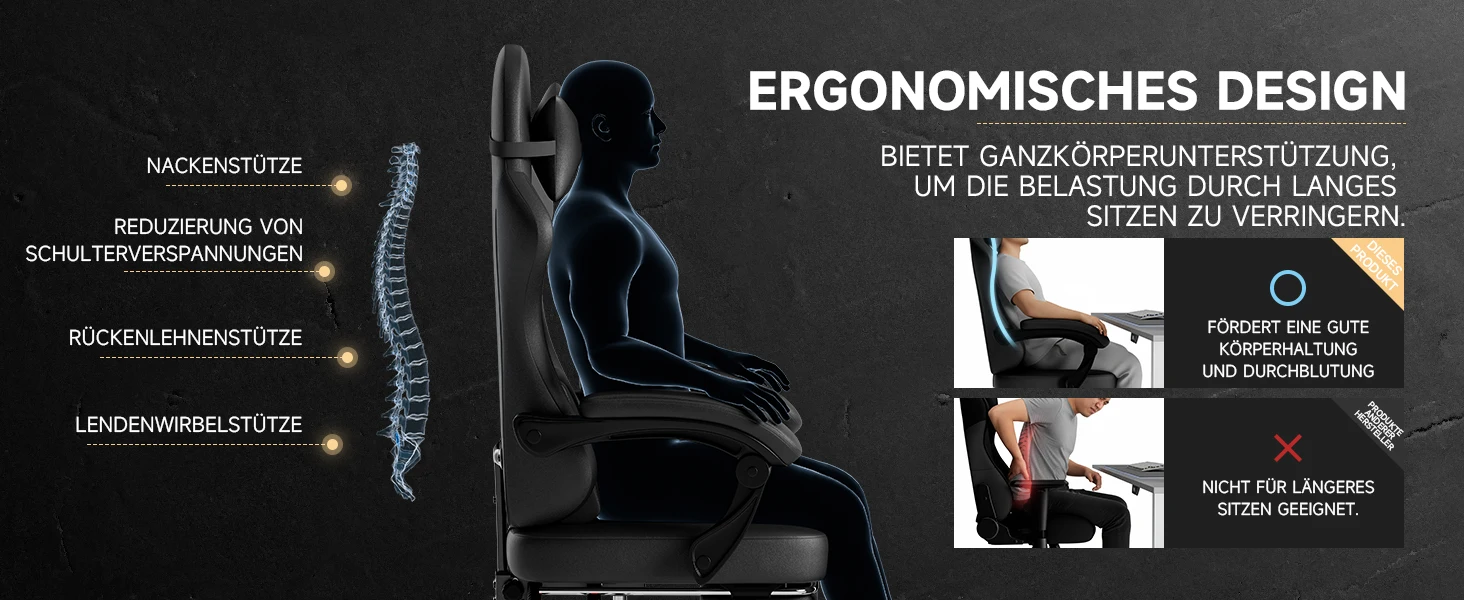 1. Ergonomic Design: The ergonomic design of the gaming chair, with the back naturally aligned with the human spine, provides all-around support from the neck to the waist. Headrest and lumbar support help distribute stress, maintain natural curvature in the cervical and lumbar spine, and relieve discomfort from sitting for long periods. Scientific support structure, helps users maintain the correct sitting position, reduce the body burden, and improve comfort