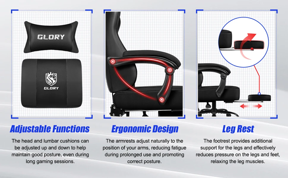 The armrests adapt naturally to your arm position, helping reduce fatigue during extended gaming or work sessions. Adjustable headrest and lumbar cushions provide essential spinal support, promoting good posture and overall comfort. The integrated footrest offers additional leg support, easing pressure on your legs and feet, and enhancing relaxation. Designed for long hours of use, this chair helps keep your body aligned and supported from head to toe.