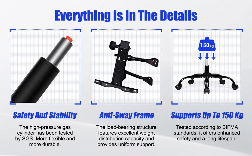 This gaming chair is designed with your safety in mind. The high-pressure gas lift cylinder is SGS certified, ensuring long-lasting performance with increased flexibility and durability. The anti-sway frame distributes weight evenly, providing enhanced stability and reducing wobble during intense movements. Supporting up to 150 kg, this chair has been tested according to BIFMA standards for maximum safety and extended lifespan. Whether you're gaming, working, or relaxing, you can trust this chair to deliver strong structural support and reliable performance.