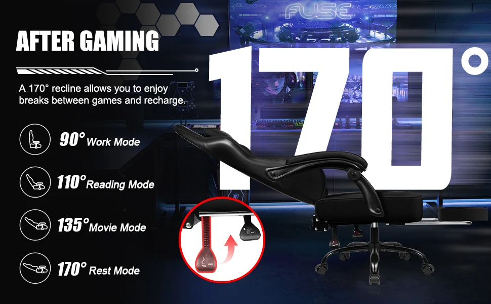 With a 170° recline feature, this gaming chair is built for comfort beyond gameplay. Whether you're in Work Mode (90°), Reading Mode (110°), Movie Mode (135°), or Rest Mode (170°), the chair adapts to your needs at every angle. Enjoy smooth reclining with an easy-to-use lever—perfect for recharging between intense gaming sessions or simply relaxing in your own comfort zone.