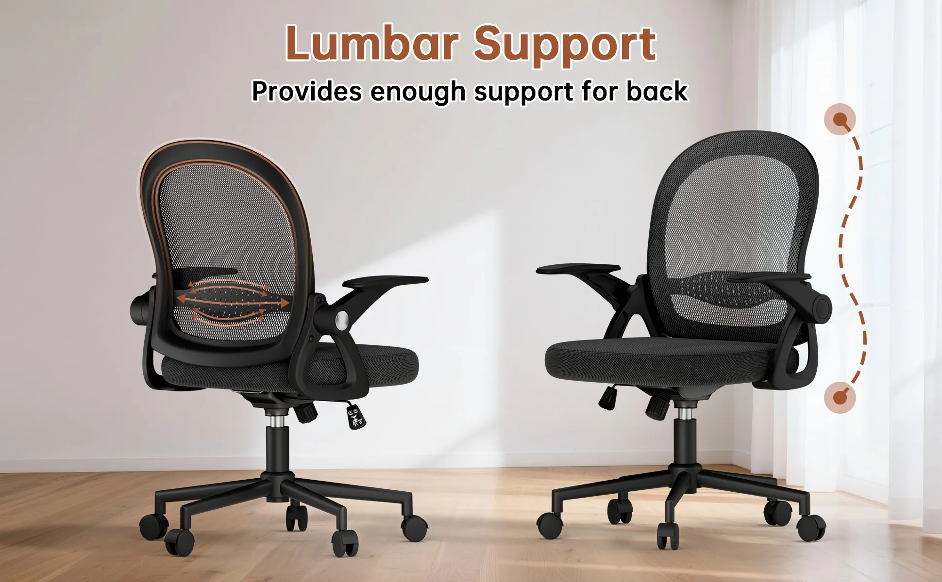 -- Flip-up armrests: The chair includes flip-up arm rest that offer comfortable support while working. When not in use, the arm rests can be flipped up, allowing you to tuck the chair under the desk to save space, making it ideal for both home and office use.