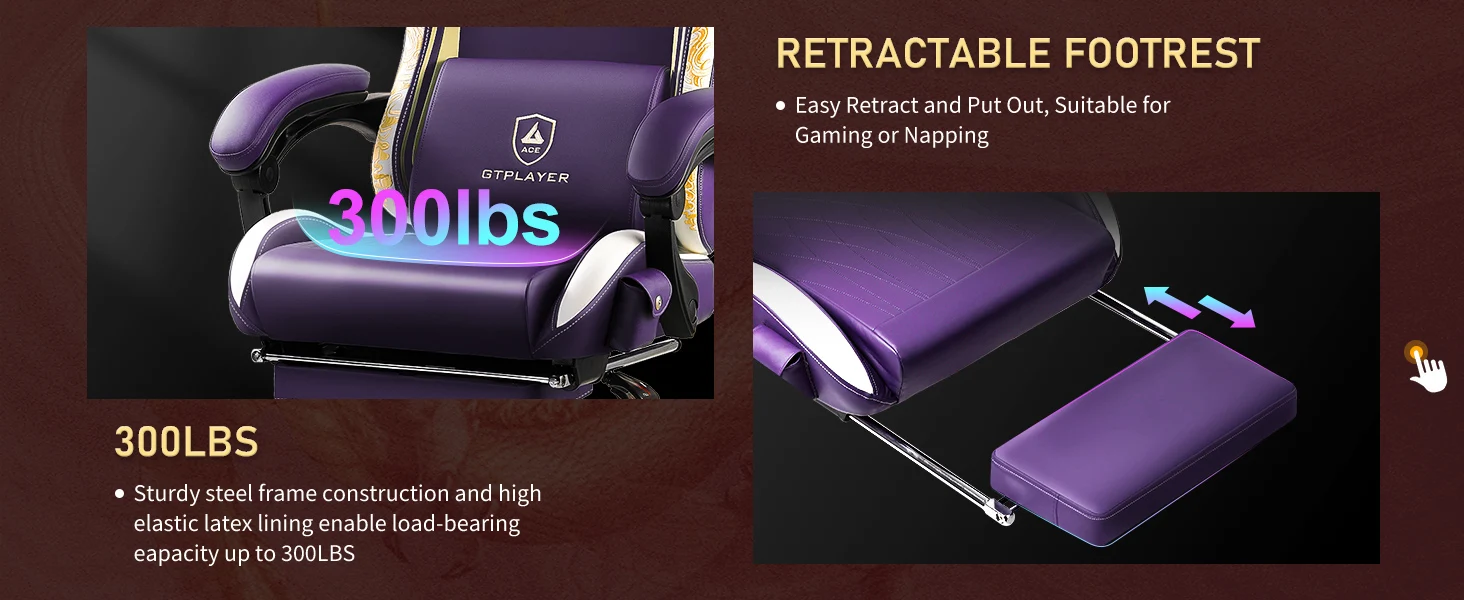 Design Features:360 ° rotation and multidirectional nylon wheels allow you to move quietly; ergonomic, soft pads protect your neck and spine. The gaming chair features a 150-degree adjustable backrest, retractable footrest and connected armrests. As fatigue sets in, pull out the footrest, sit back, sync Bluetooth and sit back in your chair to enjoy 6D surround music. This office gaming chair is perfect for working, learning and entertainment.