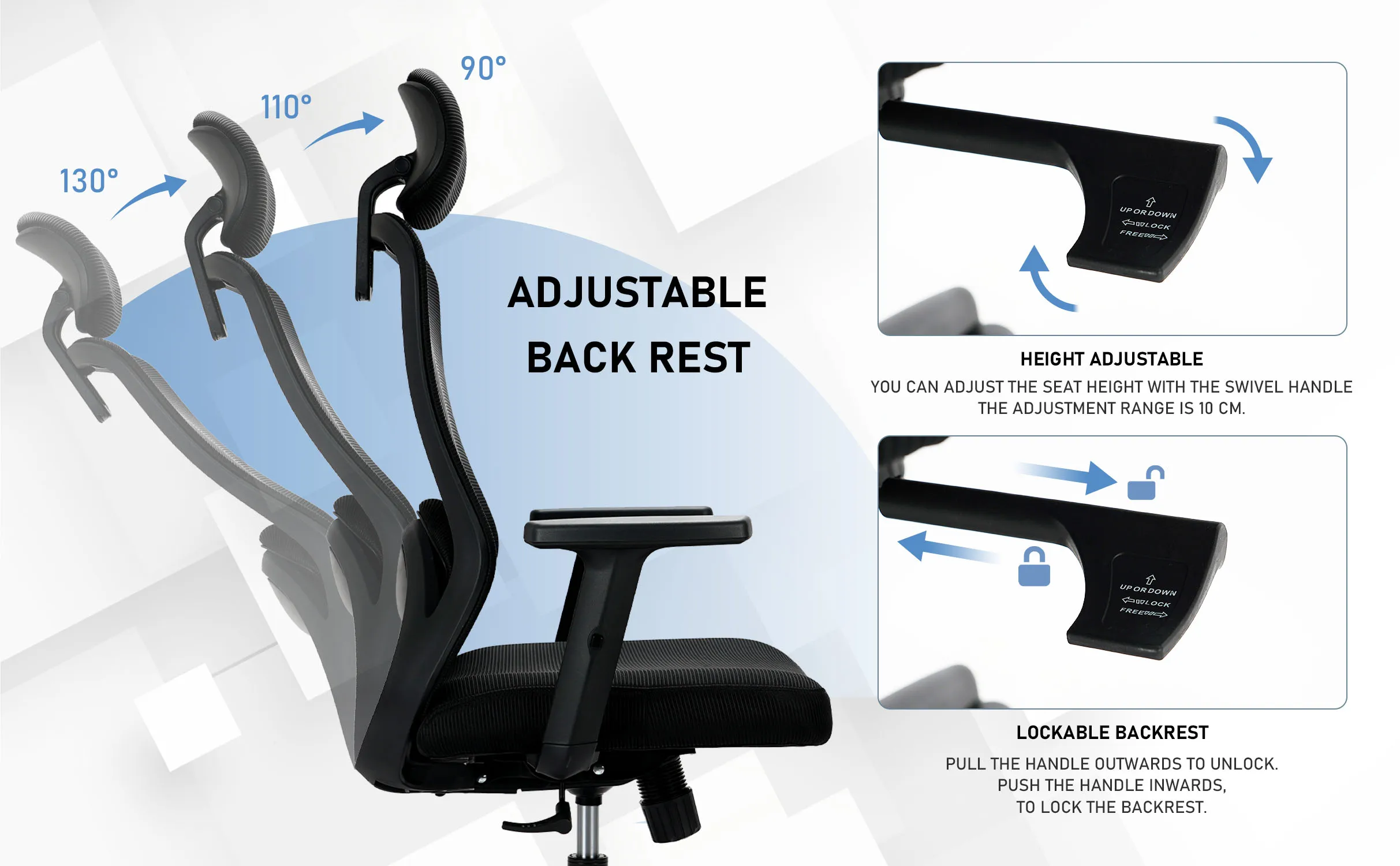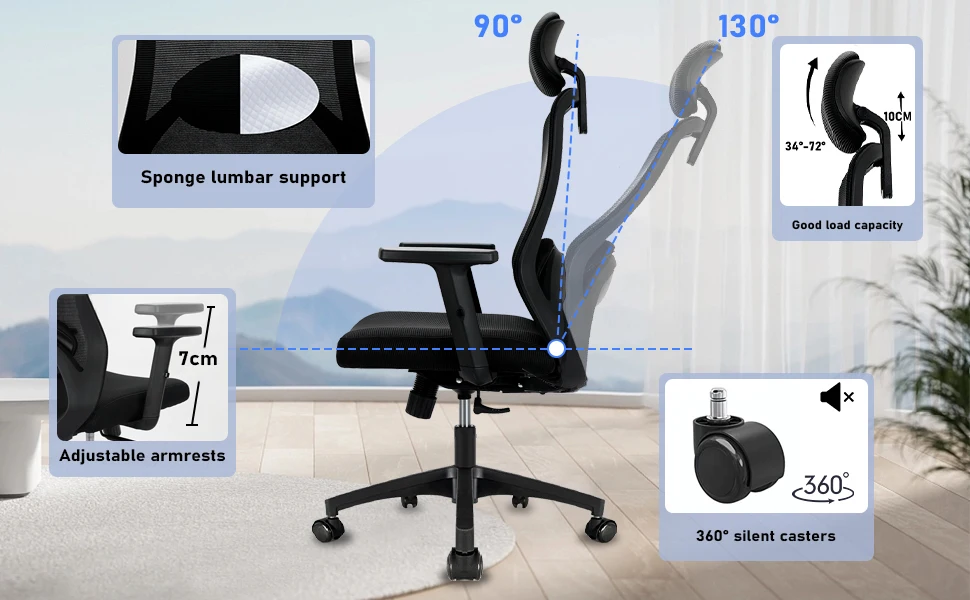 Ergonomic desk chair supports the height and tilt adjustment (35°-72°) of the headrest, the 7cm height-adjustable armrests of the ergonomic office chair support the elbows while working. The height range of the executive chair adjustable gas spring is 10cm, the tilt angle of the backrest of the office chair is 90°~130°. The angle of the backrest can be locked at 90°, 110° and 130°.