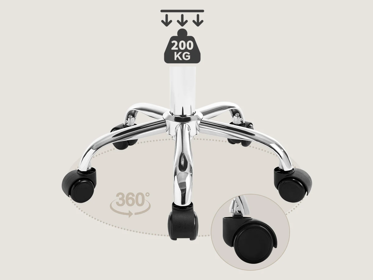 ERGONOMIC DESIGN: The curved backrest of the swivel chair adapts to the shape of the body; the seat can be rotated 360° and is height adjustable from 40 to 47.5 cm; Thanks to the 5-star base with wheels, you can easily get where you want to go