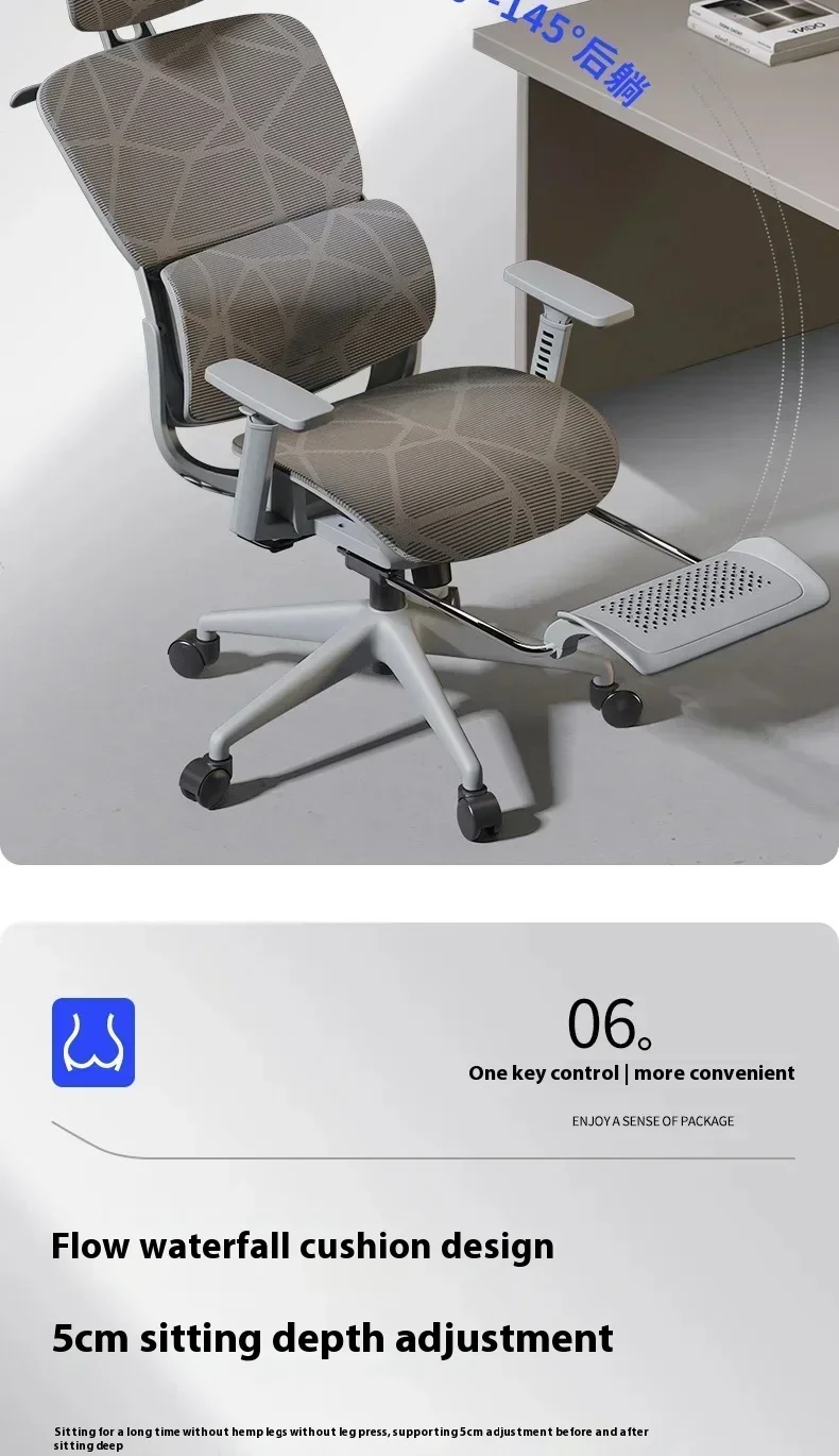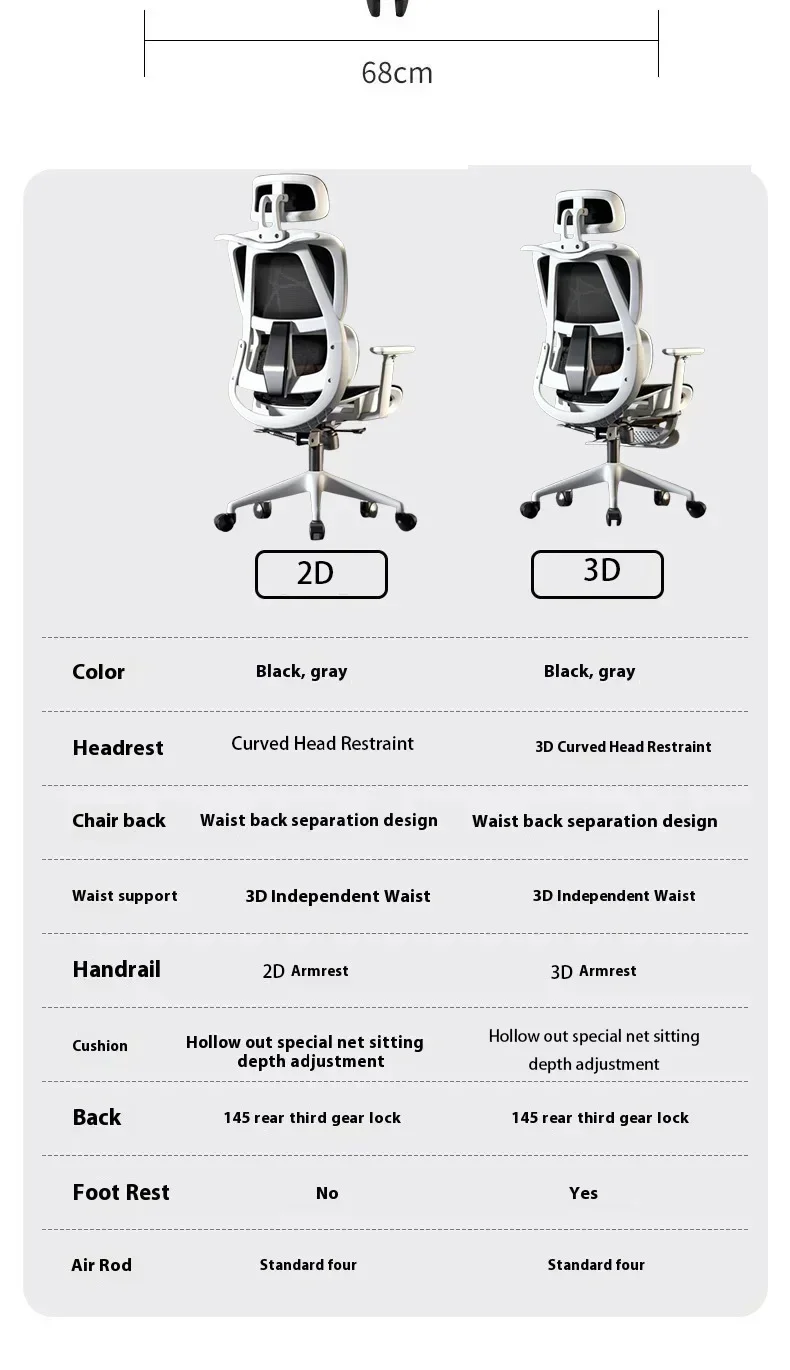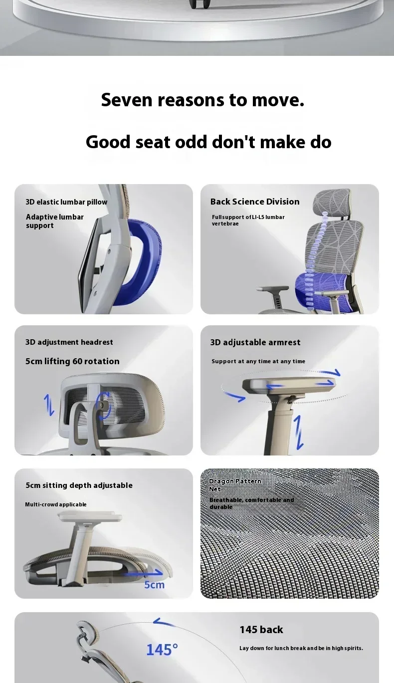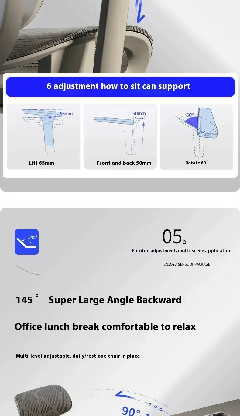 - 2. Elastic adaptive lumbar support, 3D adjustable neck pillow, 3D armrests, 2 zones of separation of the lumbar back, 5cm sitting depth adjustable, 145 ° comfortable back lying