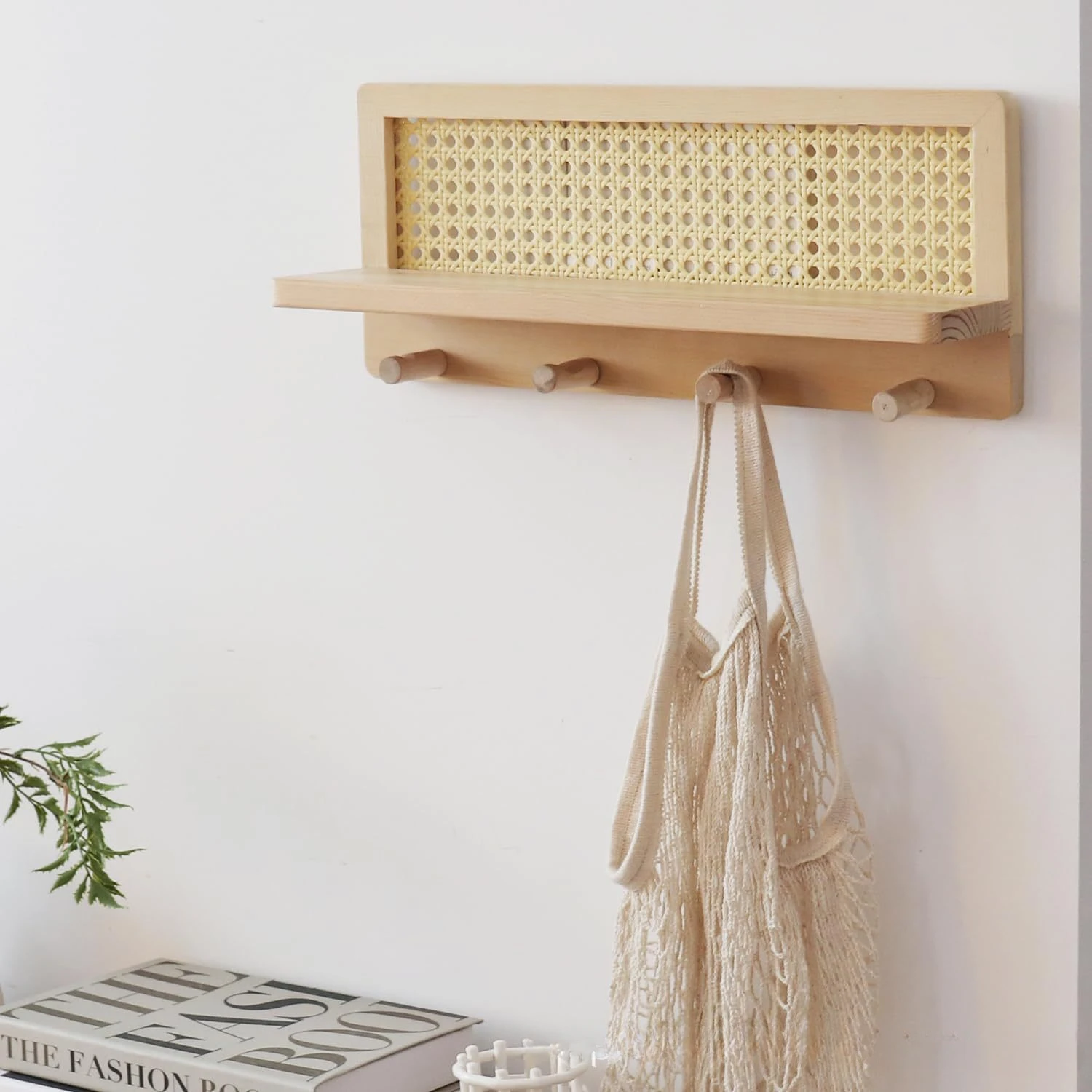 Home Woven Wall Key Hook Storage Rack Solid Wood Rattan Storage Rack Book and Newspaper Rack Magazine Storage Rack Decoration