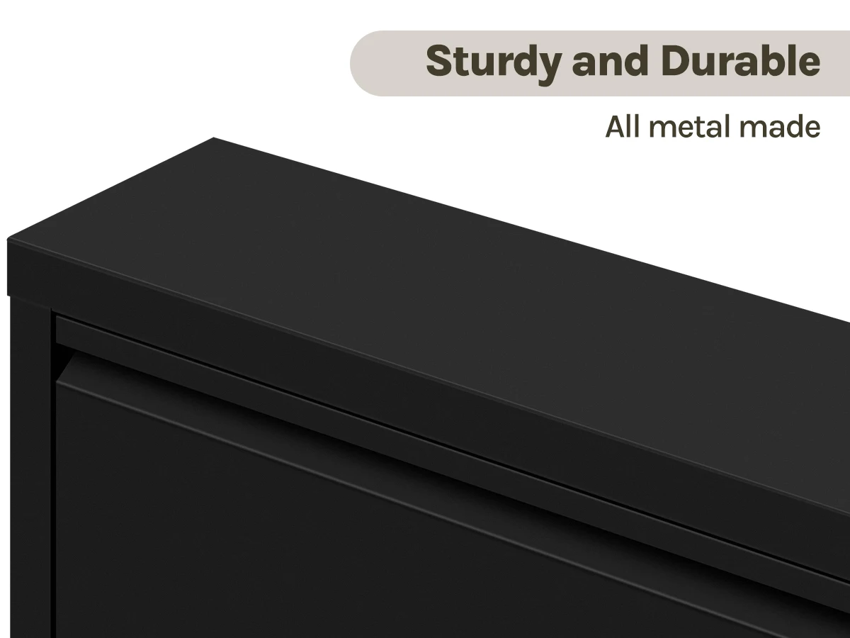 No assembly required: the metal shoe cabinet comes pre-assembled. All you need to do is attach it to the wall with the included tilt locks and can then use it safely and reliably
