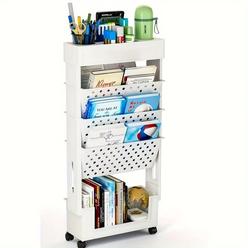 Convenient and Space-saving: Keep your books and office supplies organized with this simple tableside floor bookshelf that can be easily moved around with its roller feature.