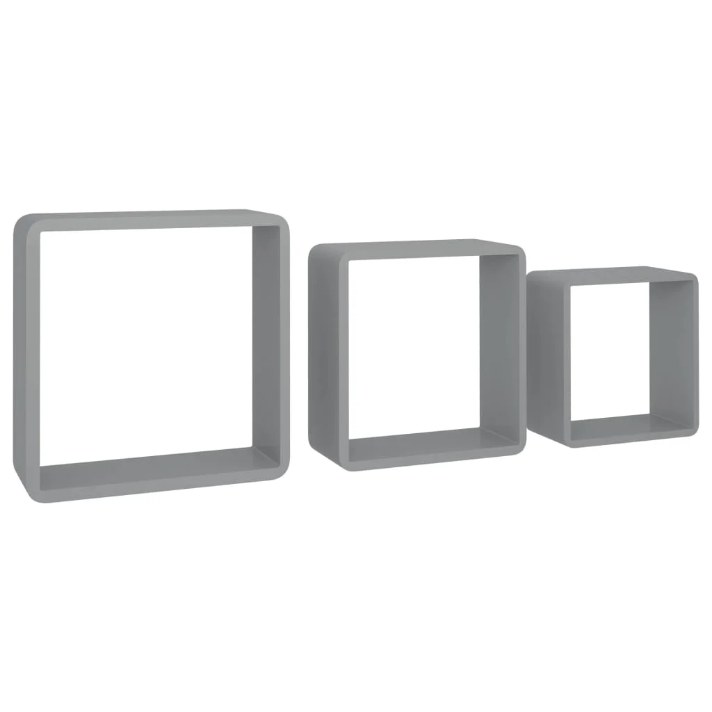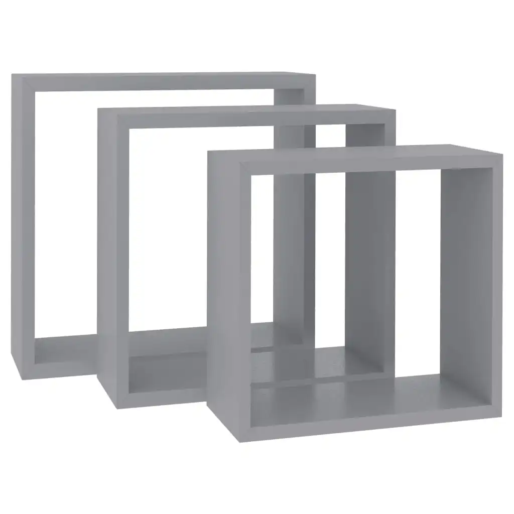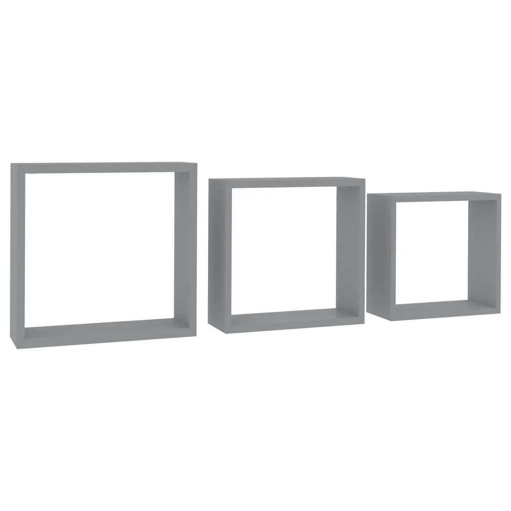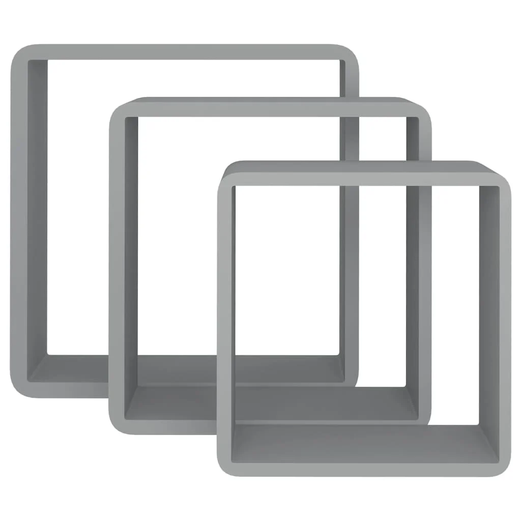 This set of 3 cube wall shelves is meant to be the focal point of any room. These cube organizers are made of MDF, which is stable and durable. With an invisible mounting system, these corner shelves are easy to install and serve as the perfect place to display items such as awards, books, collectibles, ornaments, and more. The corner shelves suit most decors and easily transform an empty wall into a design feature! Color: Gray Material: MDF Dimensions of the large cube shelf: 30 x 10 x 30 cm (W x D x H) Dimensions of the medium cube shelf: 27 x 10 x 27 cm (W x D x H) Dimensions of the small cube shelf: 24 x 10 x 24 cm (W x D x H) Maximum load capacity (each): 5 kg Invisible mounting system Assembly required Delivery contains: 3 x shelves