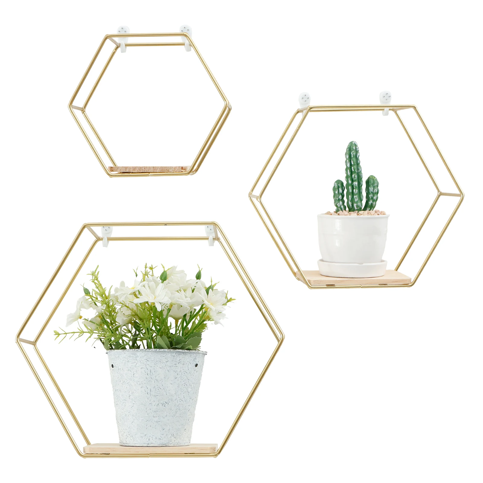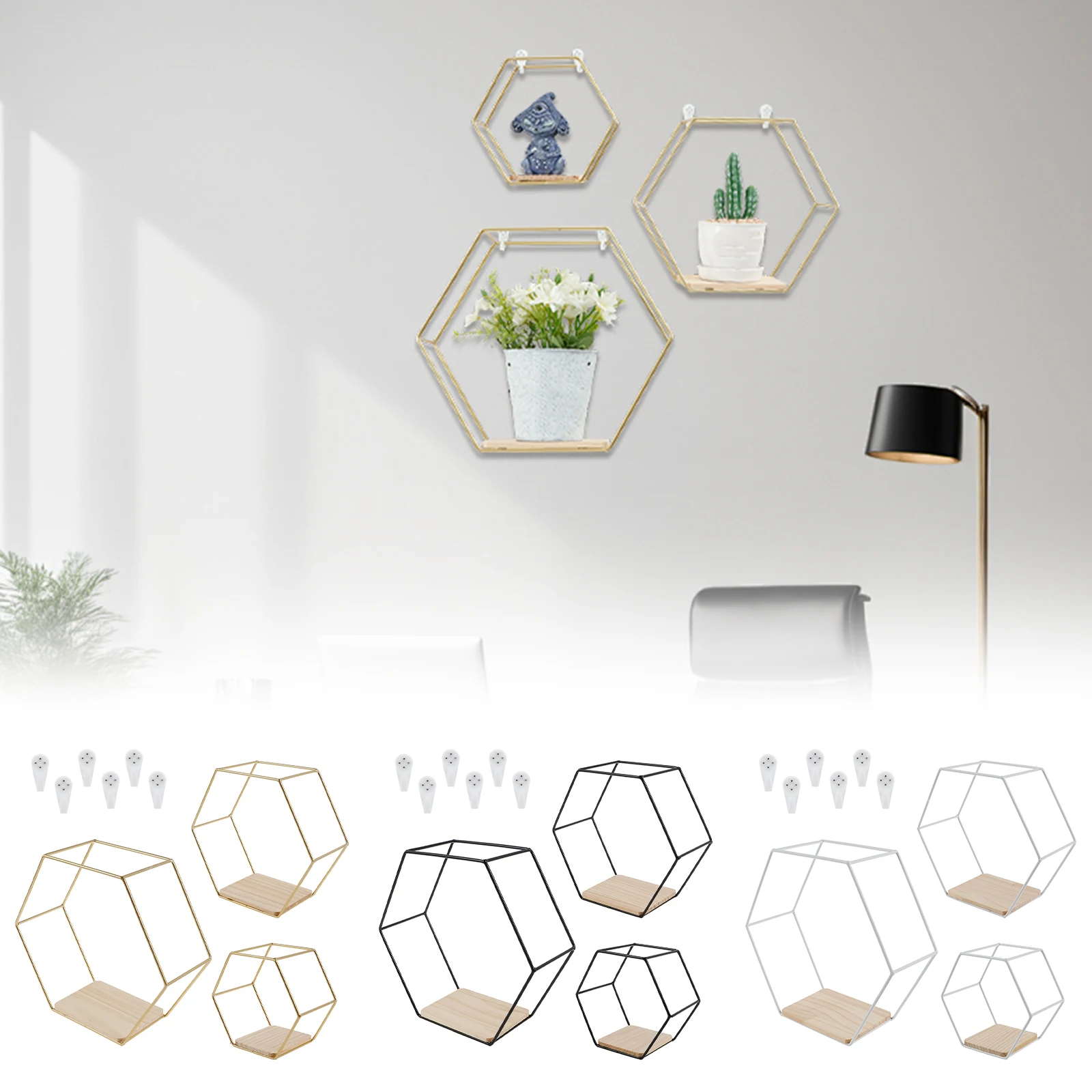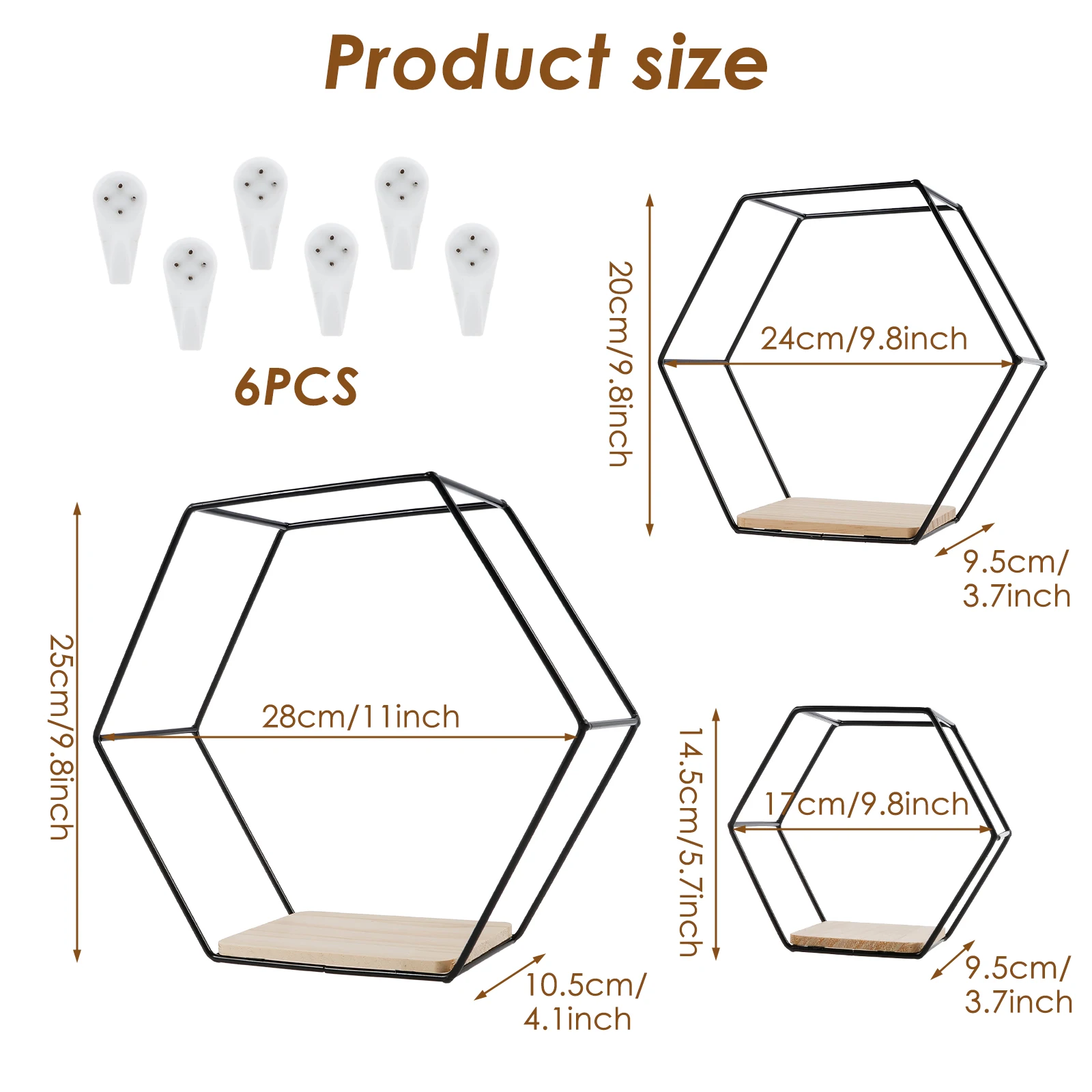 3 Sizes: The package includes three hexagonal shelves, 11 x 9.8 x 4.1 inches for large; 9.1 x 8 x 3.7 inches for medium; and 6.6 x 5.7 x 3.7 inches for small sizes; to meet the storage and display needs of different items.