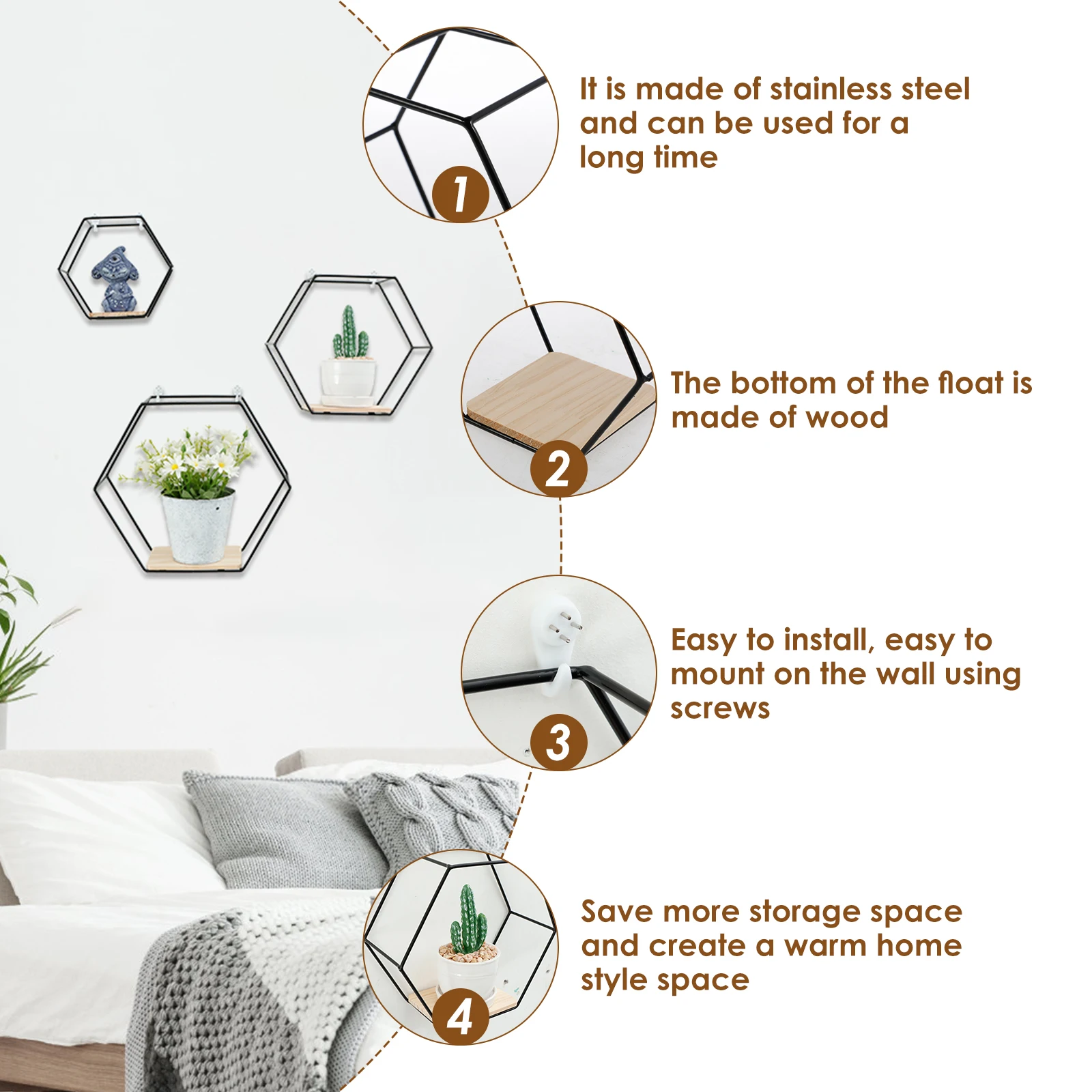 Quality Materials: Made of quality stainless steel and wood, our wall mounted hexagonal floating shelves are structurally sturdy and not easy to break, which can be used for a long time.