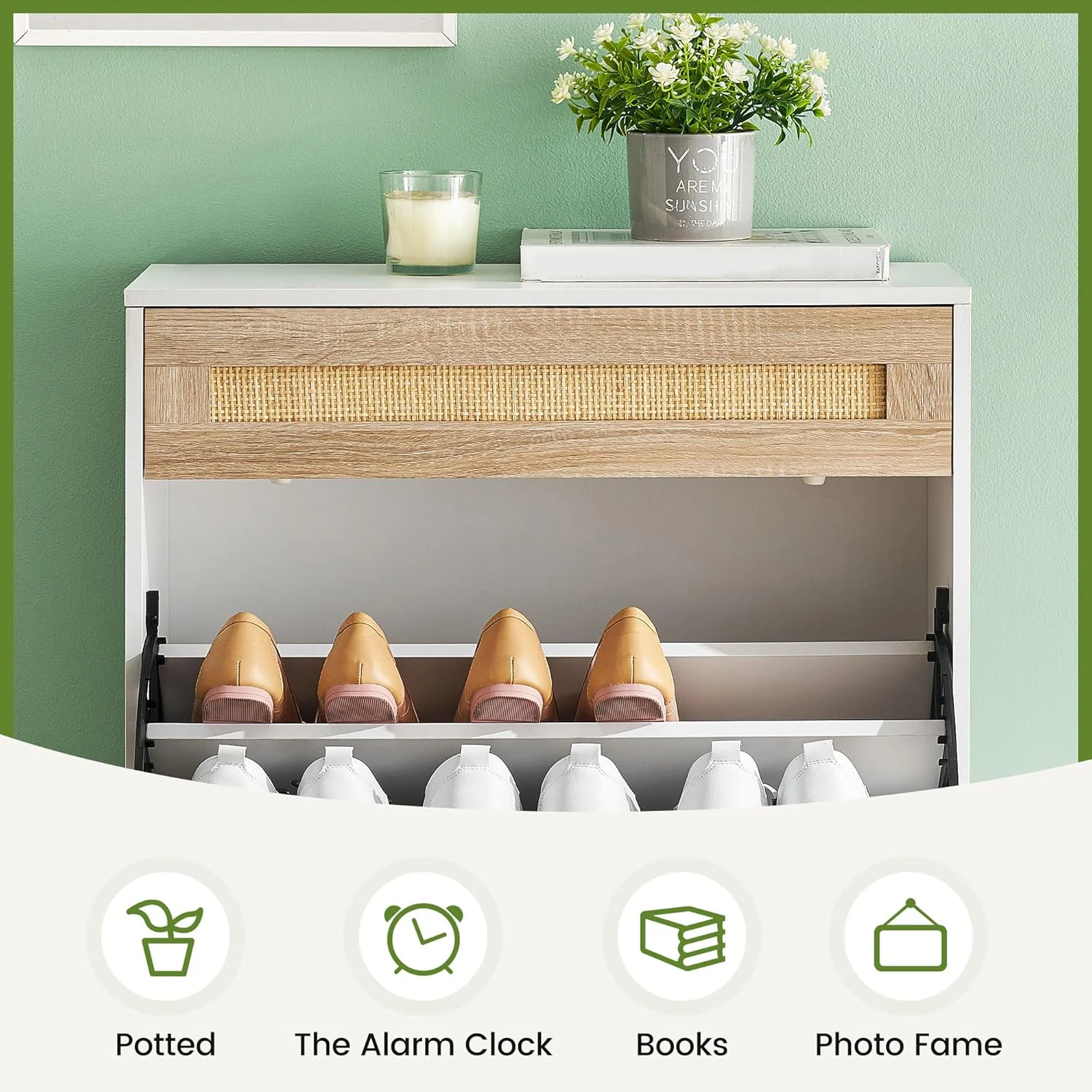 🍀🍀 Hidden Rattan Shoe Cabinet with 2 Flip Doors & 1 Drawer - Narrow Entryway Shoe Storage, Freestanding Organizer with Adjustable Shelf for Hallway, Living Room, Entrance | Stylish Space-Saving Design
