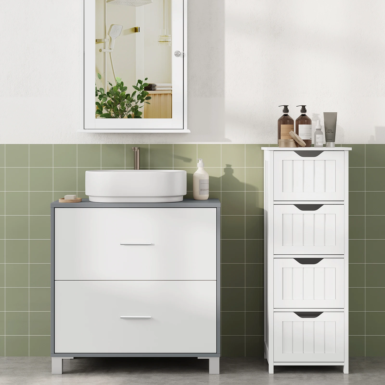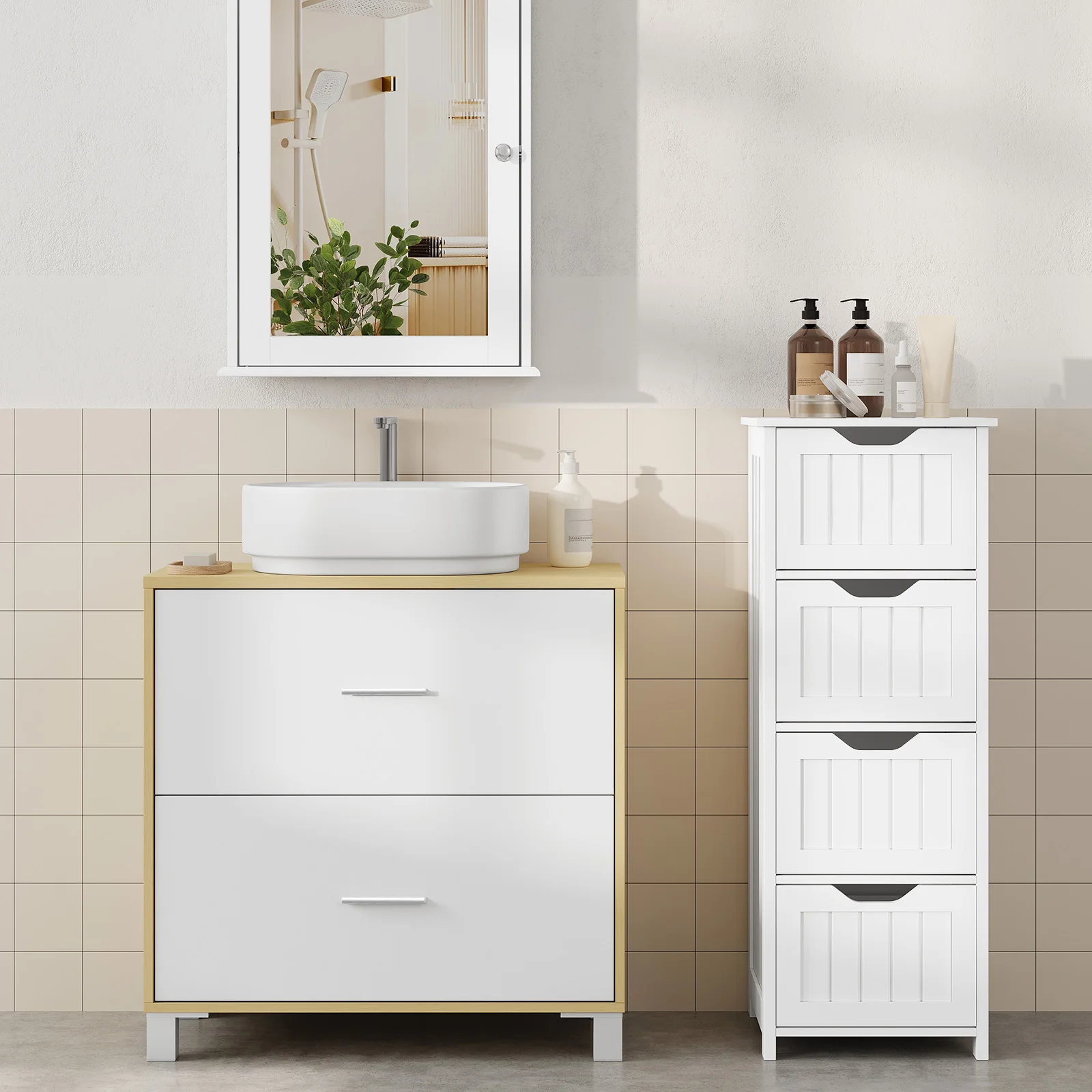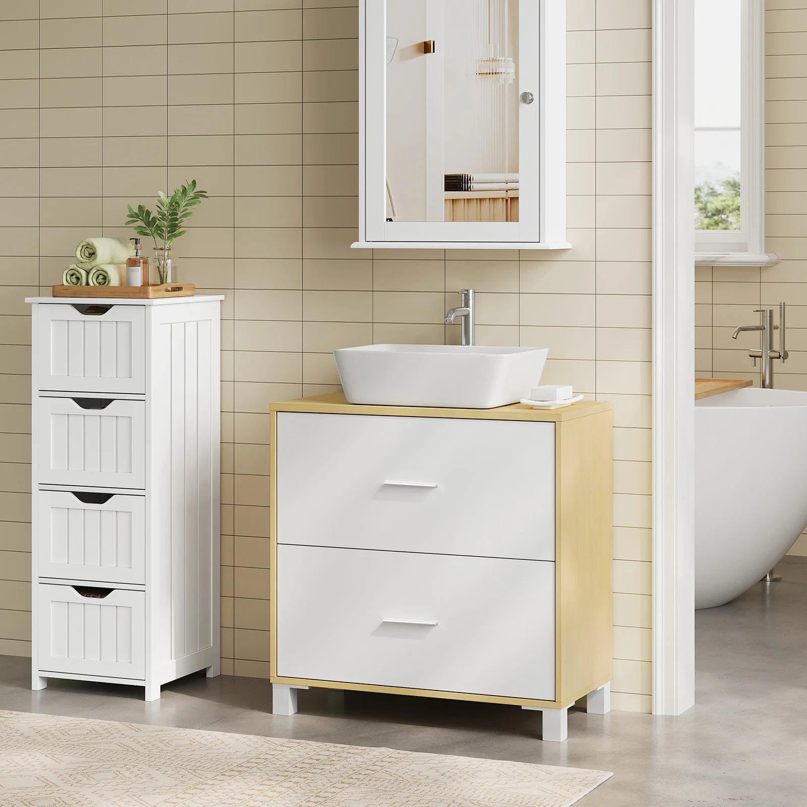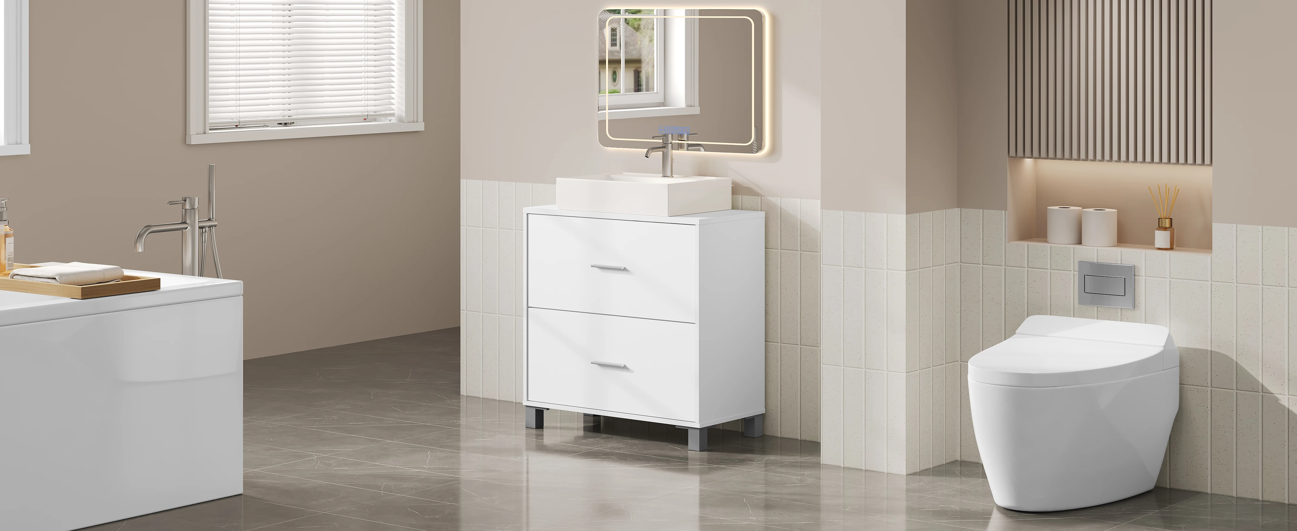 Comfortable & Practical: The bathroom base cabinet features exquisite linear handles and smooth-running guides that allow you to open and close the drawers effortlessly and quietly. In addition, the cabinet legs raise the floor to keep moisture away