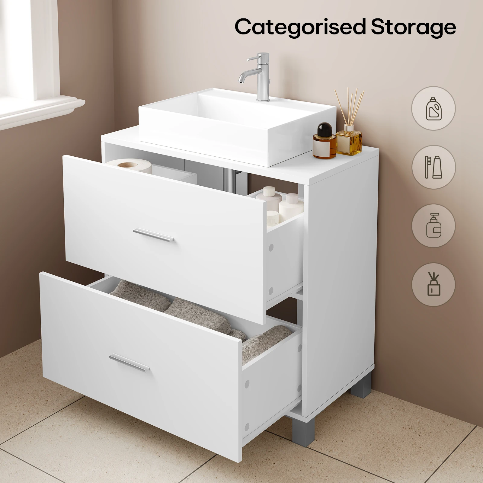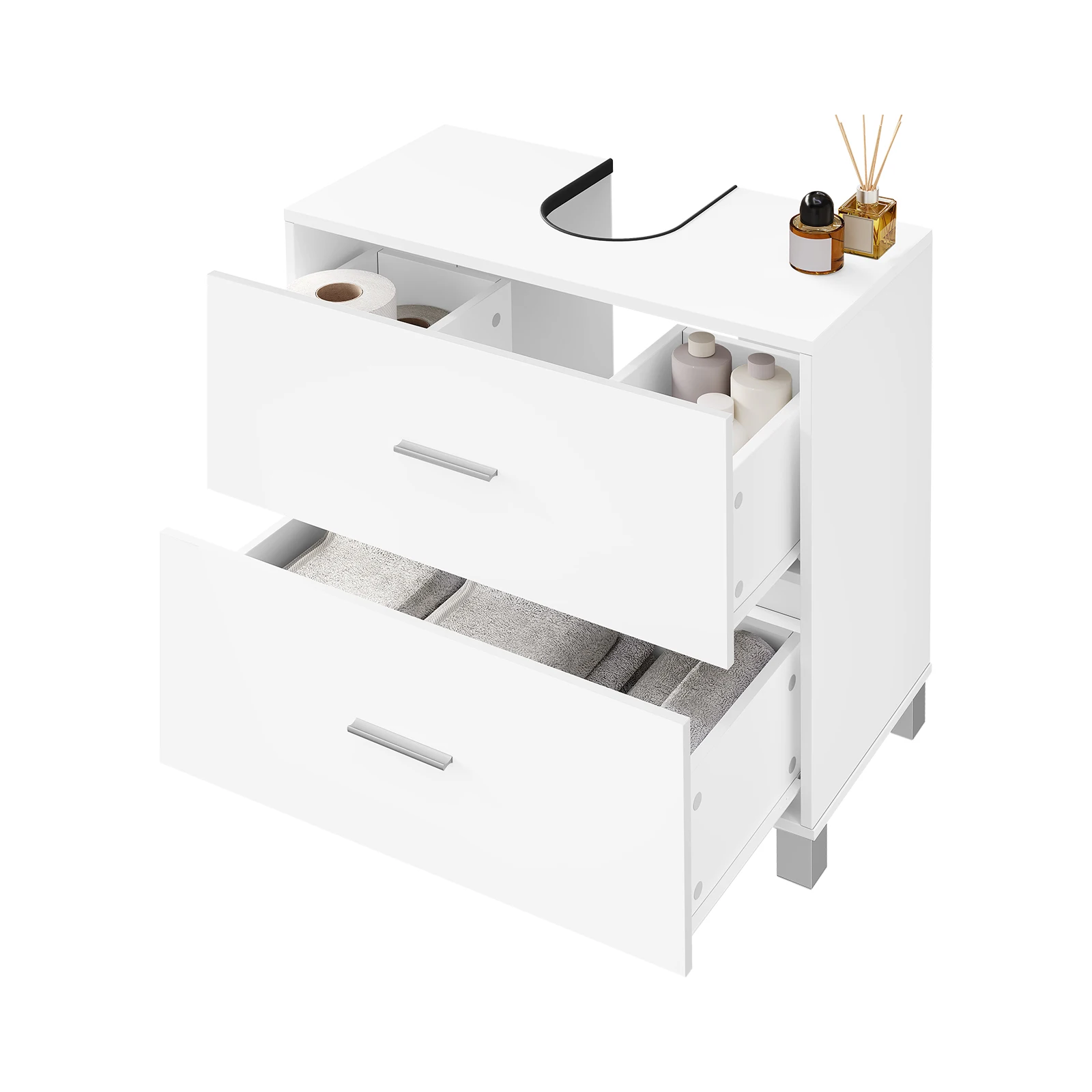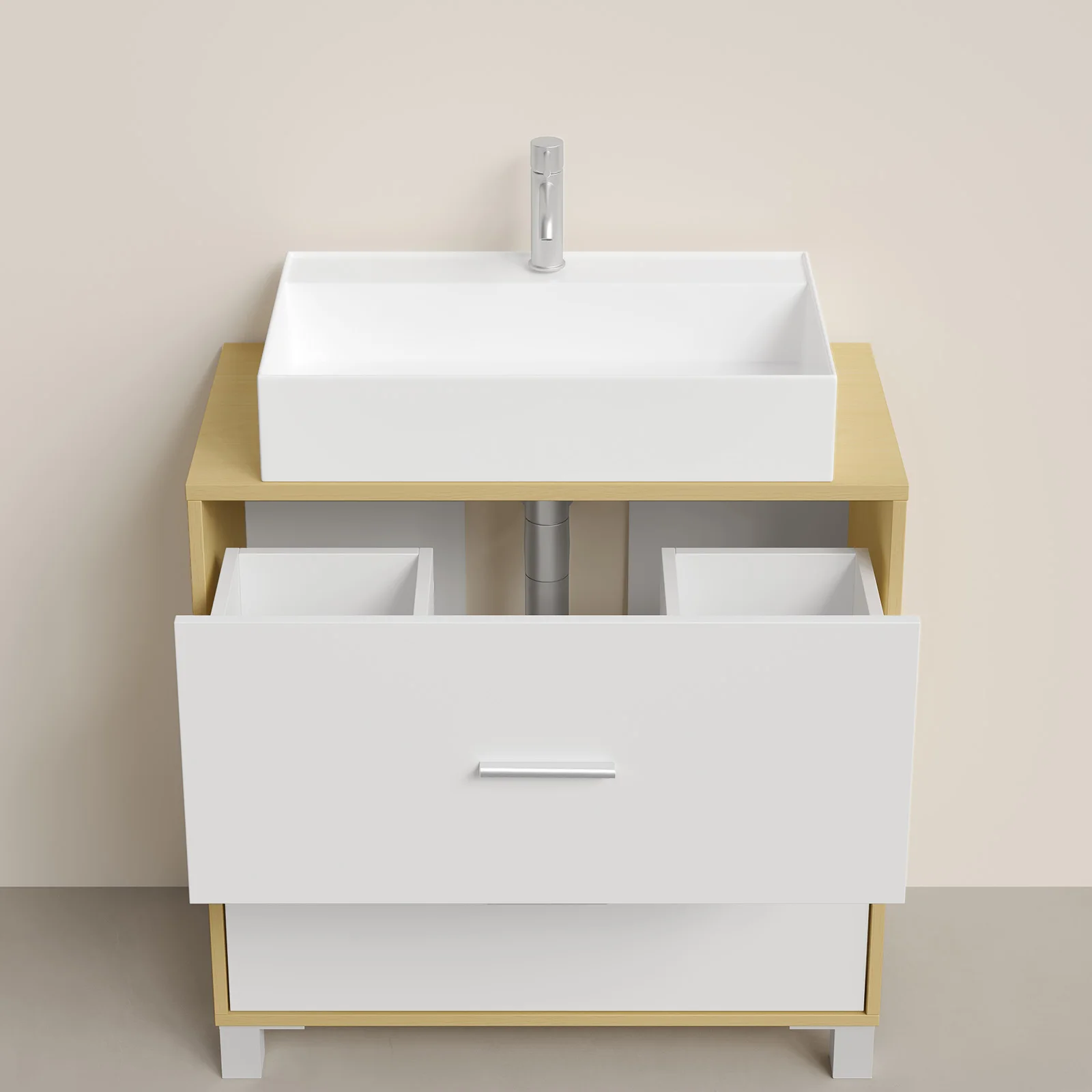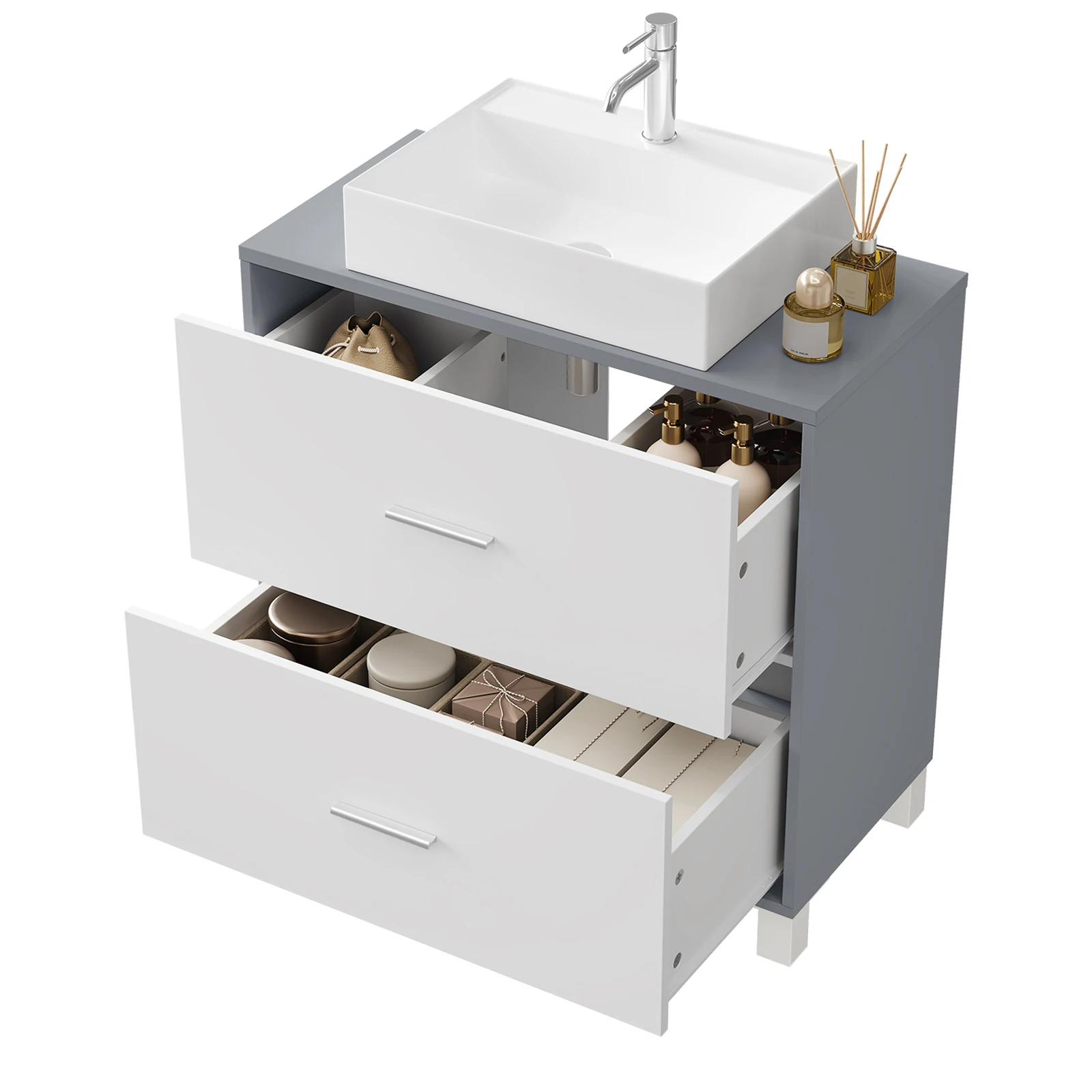Spacious Storage Space: This bathroom cabinet under sink features 1 wide top and 2 large drawers, creating ample space for you to organize your bathroom items. The top drawer is divided into 2 storage compartments;
