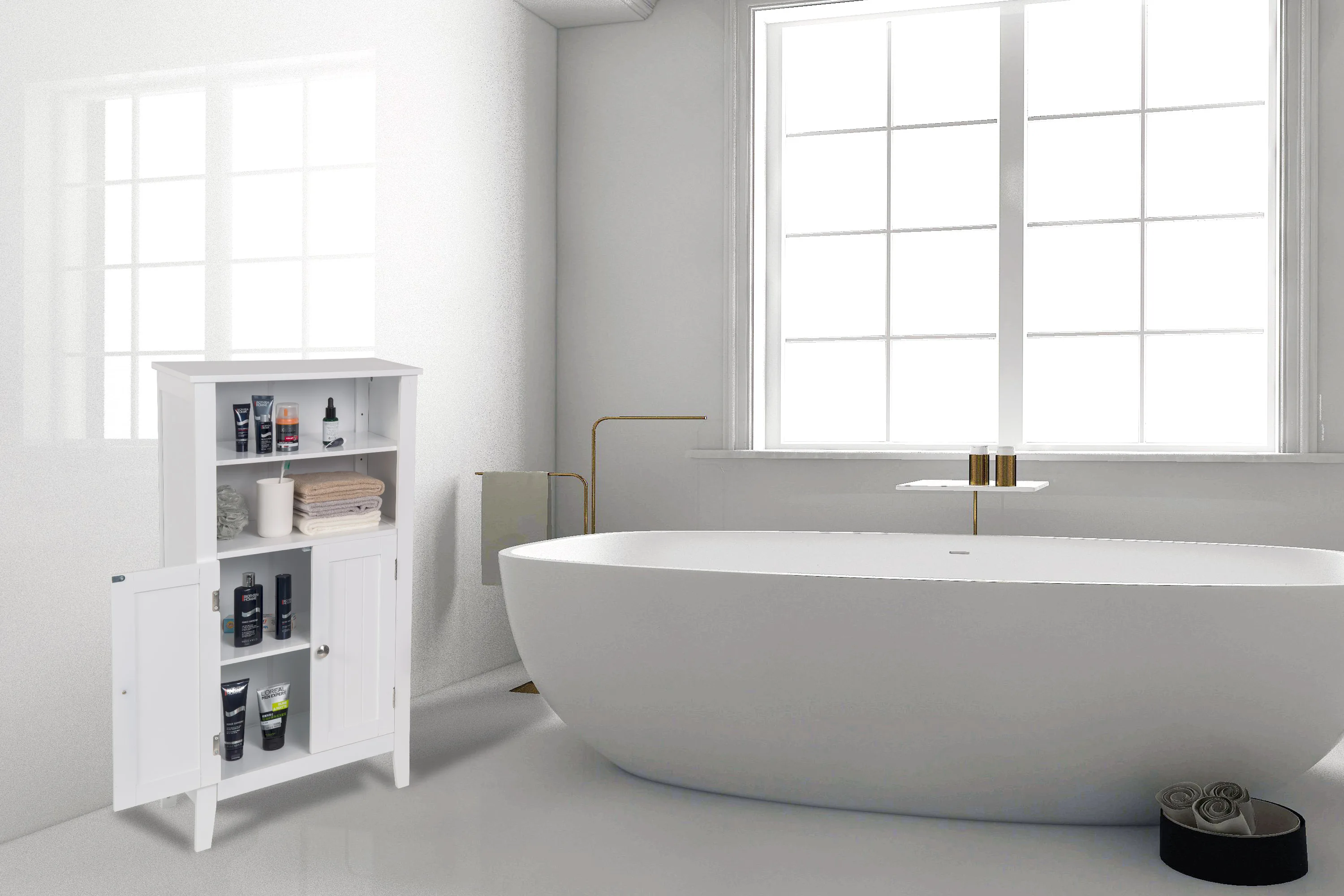 Robust and durable: The freestanding bathroom cabinet is made of E1 class MDF, which promises a stable and durable construction. The varnish makes its surface smooth and water-repellent. Total load capacity: 10 kg/level