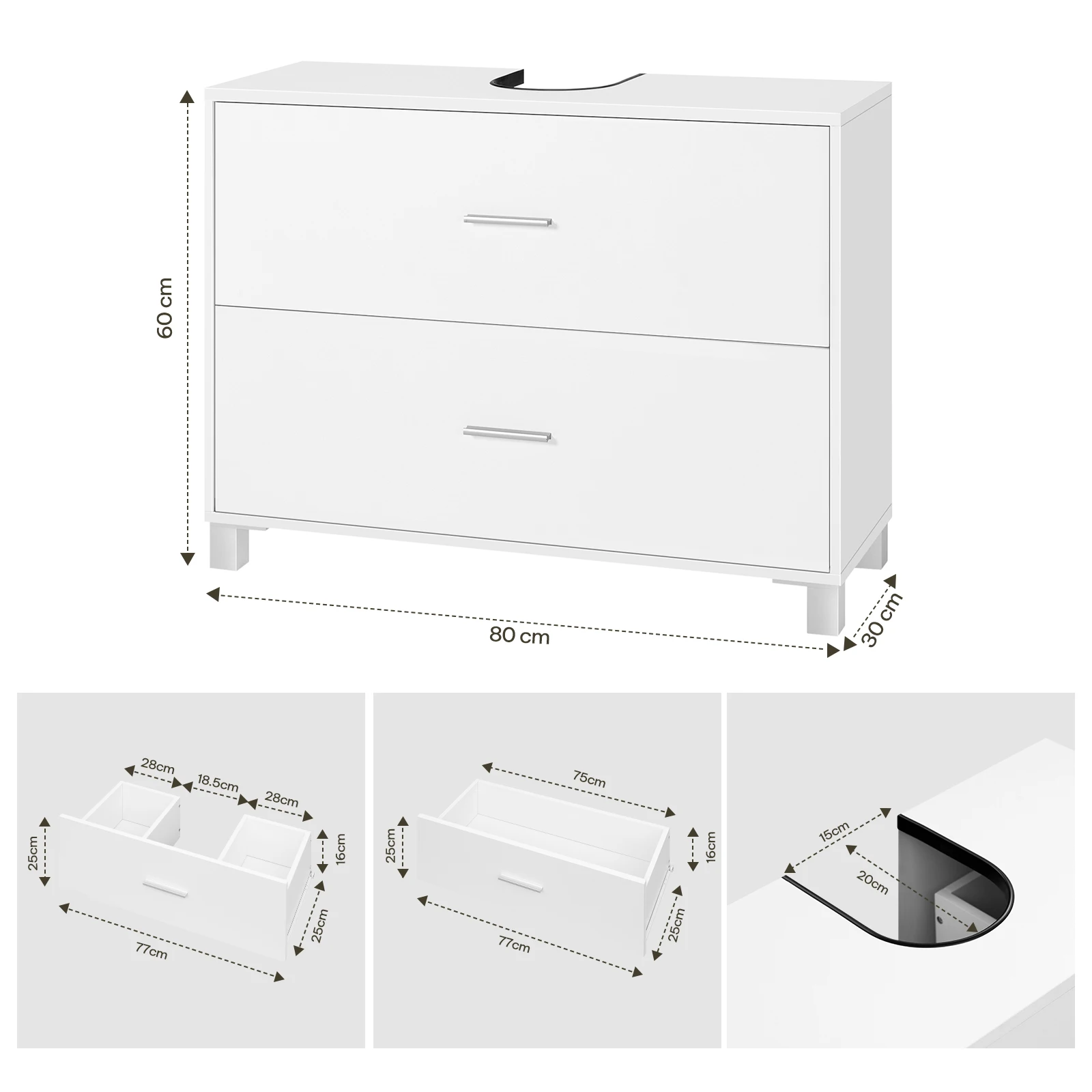 SPACIOUS STORAGE SPACE: This bathroom cabinet under sink features 1 wide top and 2 large drawers, which create enough space for you to organize your bathroom items. The top drawer is divided into 2 storage compartments; the siphon cut-out measures 15 x 20 cm, please check if it fits