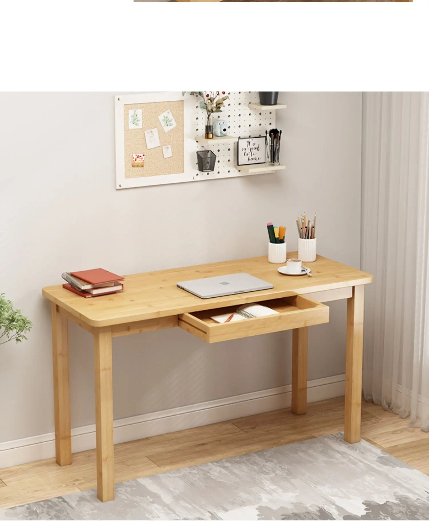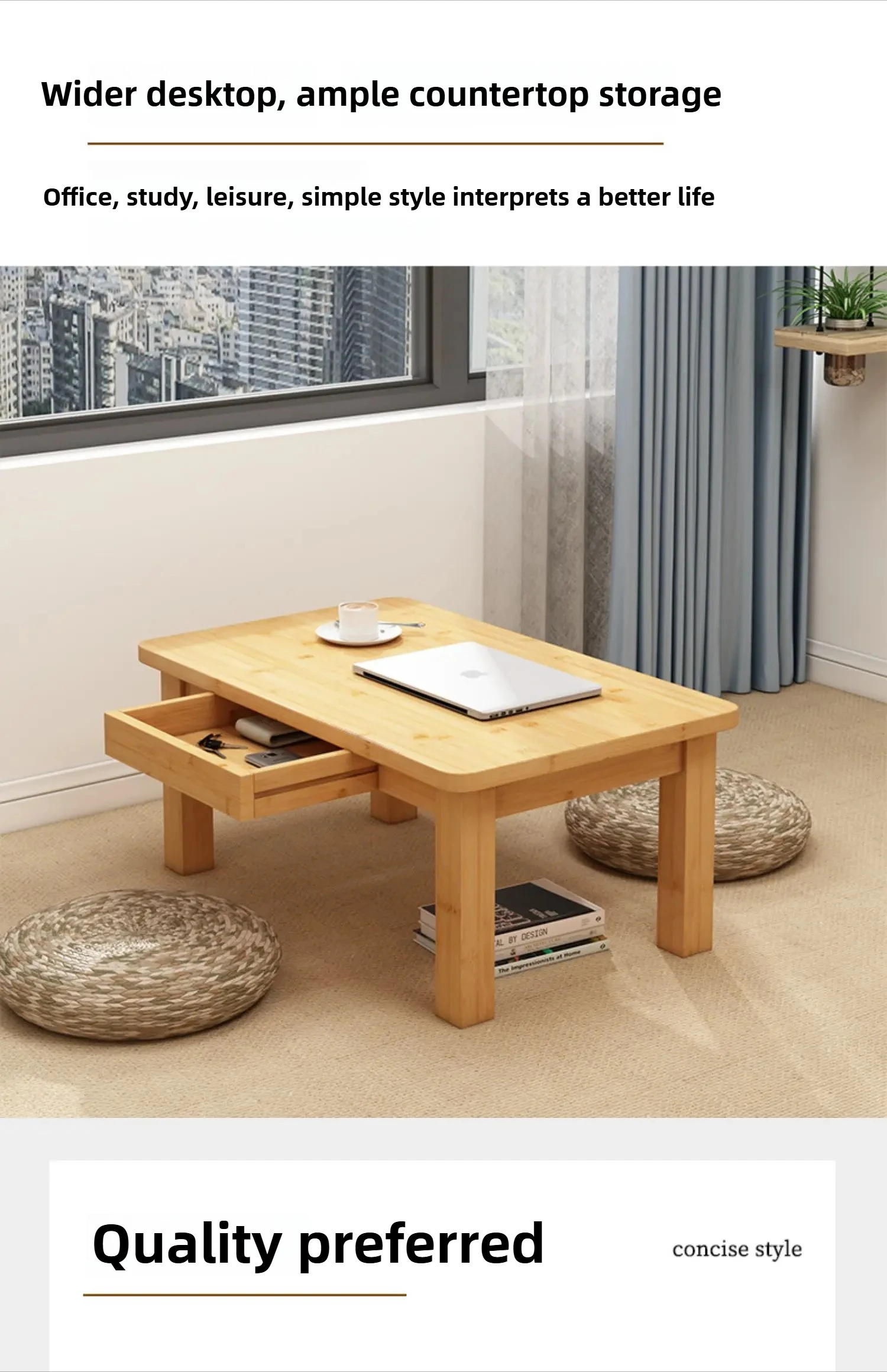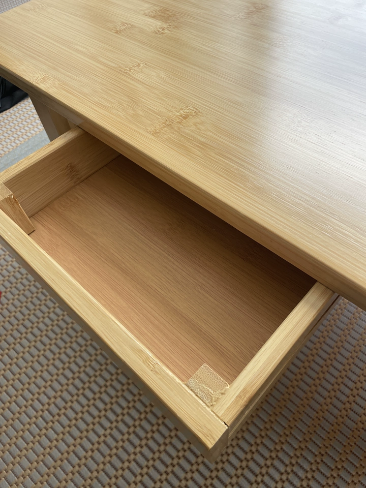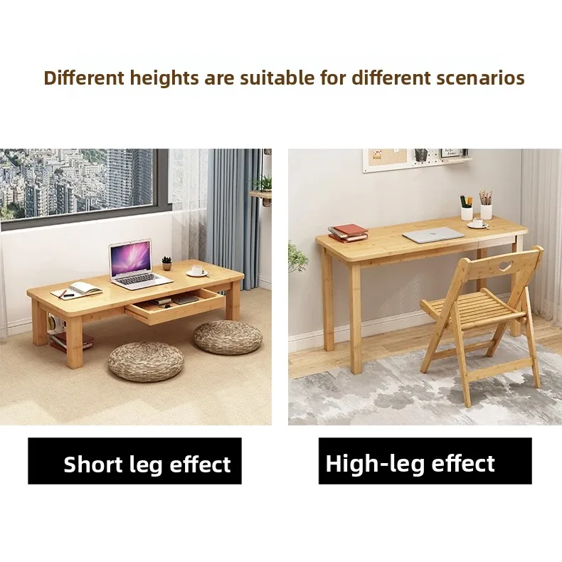 Nordic Scandinavian Style Low Study Table with Storage Drawer, Multi-Function Bamboo Wooden Desk for Dormitory Living Room