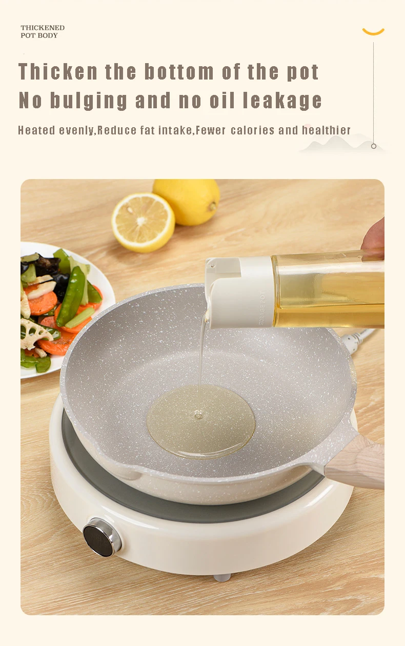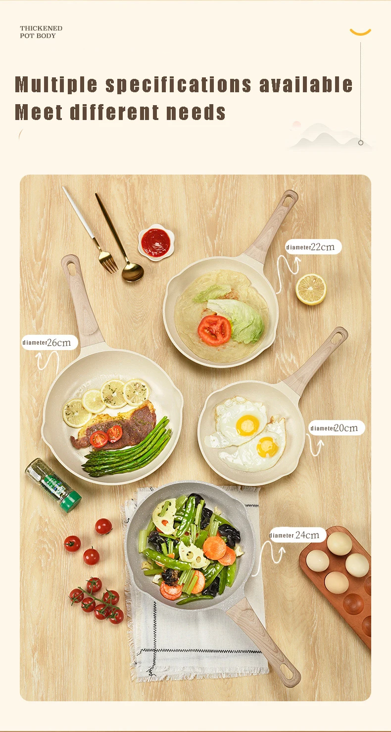 It is made of wrought iron and coated with natural medical stone. The non-stick pans currently on the market are coated. The main reason is whether the material is safe. The non-stick coating is a natural medical stone and is made of high-quality and safe non-stick The layer, does not contain FPA, is non-toxic and harmless to the human body, and can be used with confidence, and the non-stick pan has no oil fume, heat conduction, easy to clean, fuel-efficient, and light. This is the characteristic of our cookware.