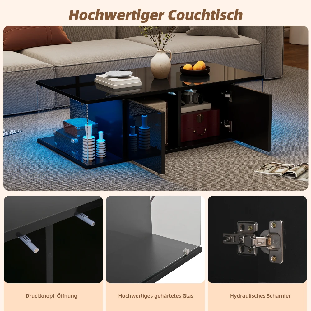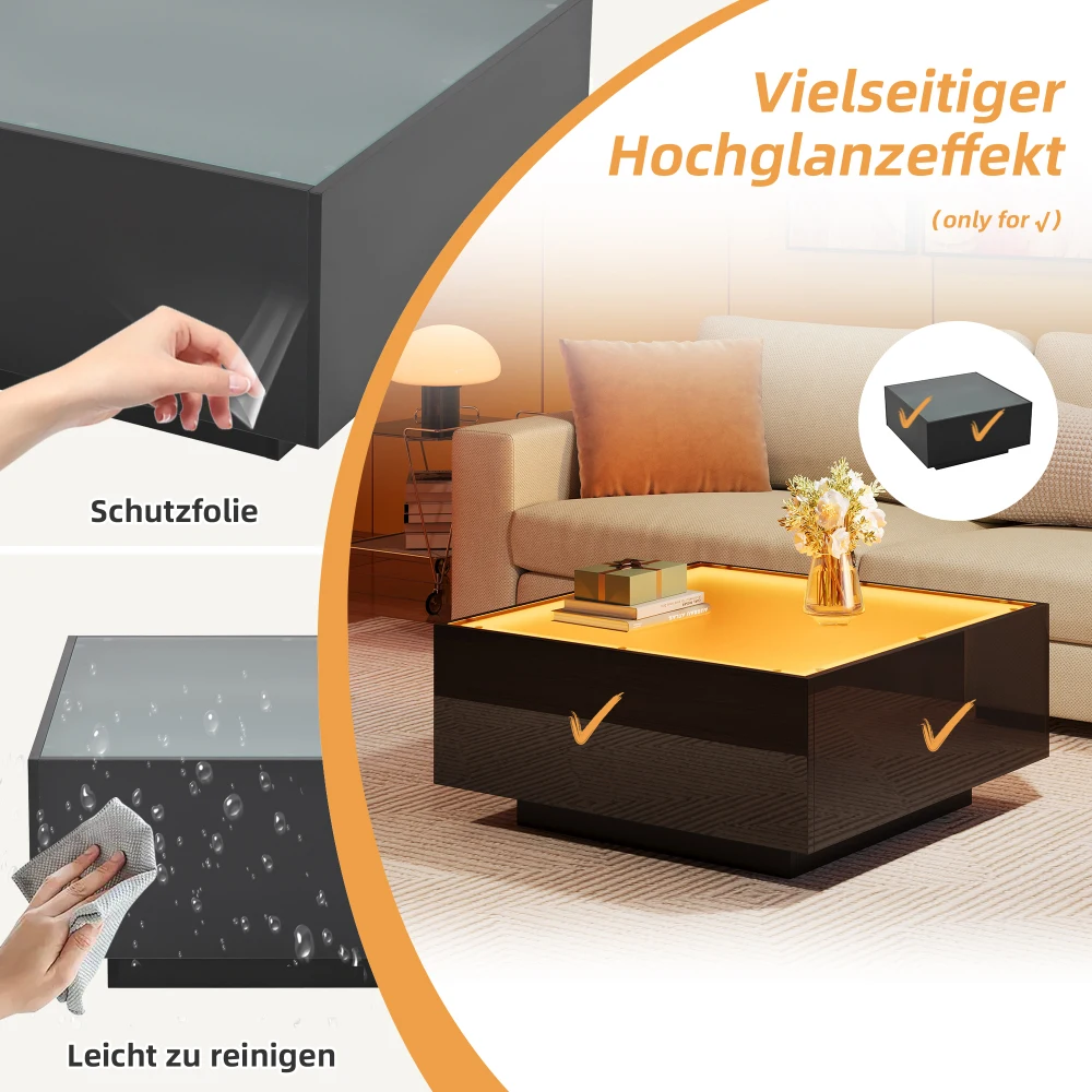 Overall size: 70 x 70 x 35 cm, square living room table, hollow on all four sides, with a hollow plate made of tempered glass, simple design, an app-controlled LED light strip, a hollow center and tempered glass on the plate. With the LED light on, the entire living room fills an atmospheric atmosphere. The large storage room in the middle offers space for books or decorations. It is made of MDF and has a recommended total load capacity of 30 kg.
