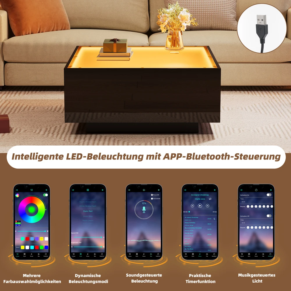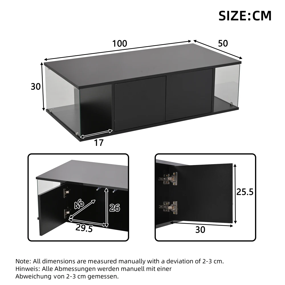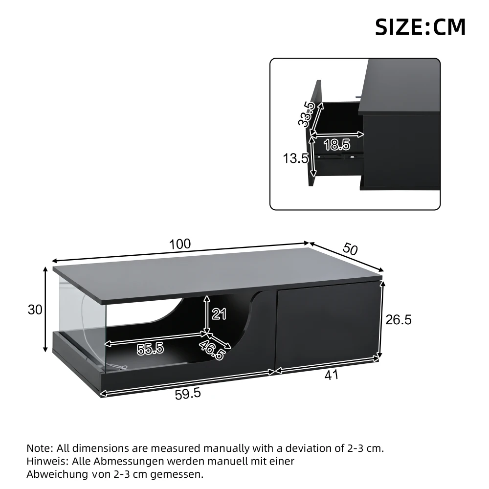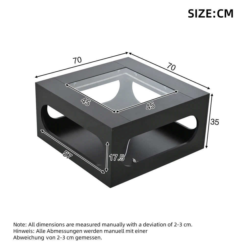 | Size 70 x 70 x 35 cm Colour black Material mdf+glass LED LED lights with mobile app control, power supply via USB – Comes with a 5 V 2 A USB cable (USB plug not included) that connects to your TV, computer, Your power bank, etc. can be connected. Safe and easy to use indoors Note Due to different recording conditions and display devices, there may be slight color deviations between the actual product and the image. This is normal and does not pose a quality problem. We strive to restore the actual colors of the product. Please place your order carefully. Gross Weight/Net Weight 20.4kg/17.8kg Highlighting top + black part around bearing 30kg Square Design/Simple Design/Hollow/Tempered Glass |