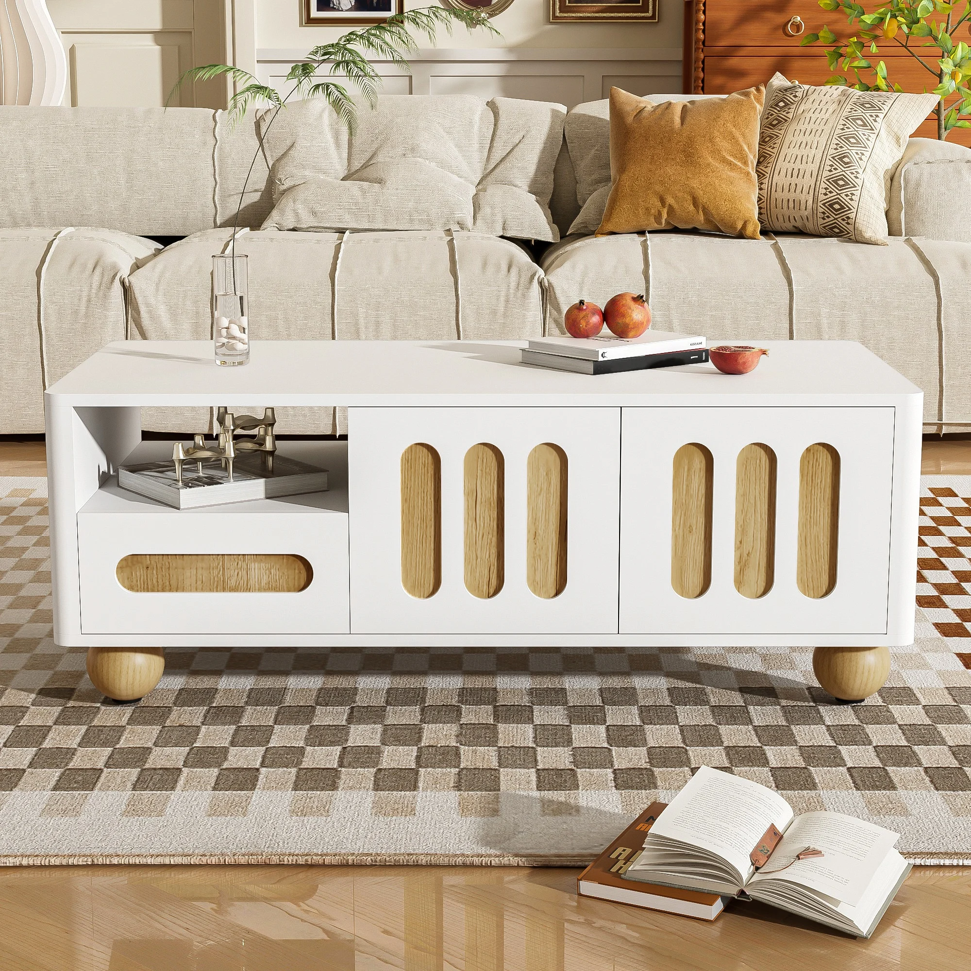 🌸Practical storage space The table has 2 doors, 1 drawer and hand fan, thus providing ample space to keep books, remote controls and other everyday items tidy-perfect for a tidy living room corner.