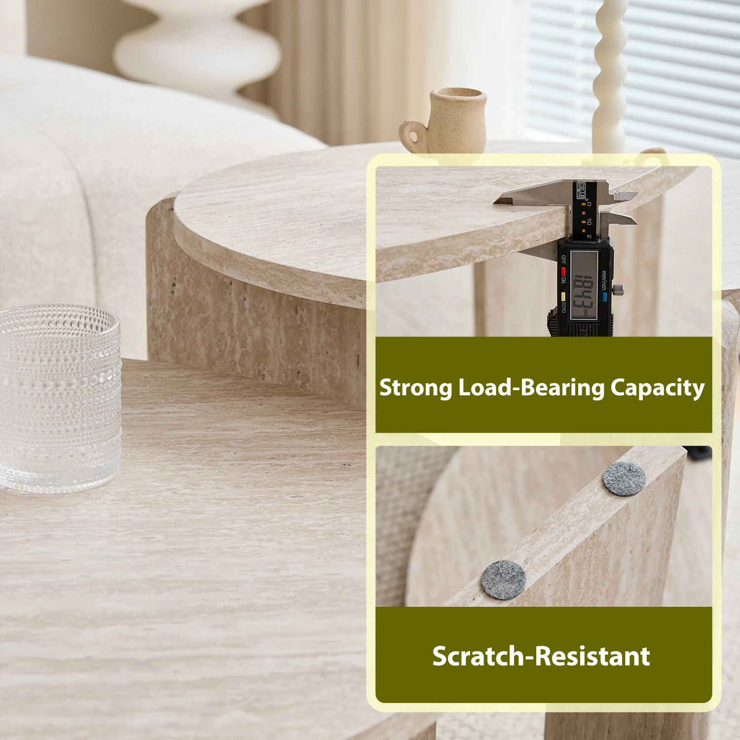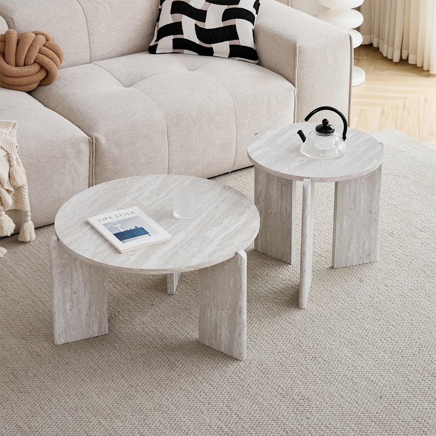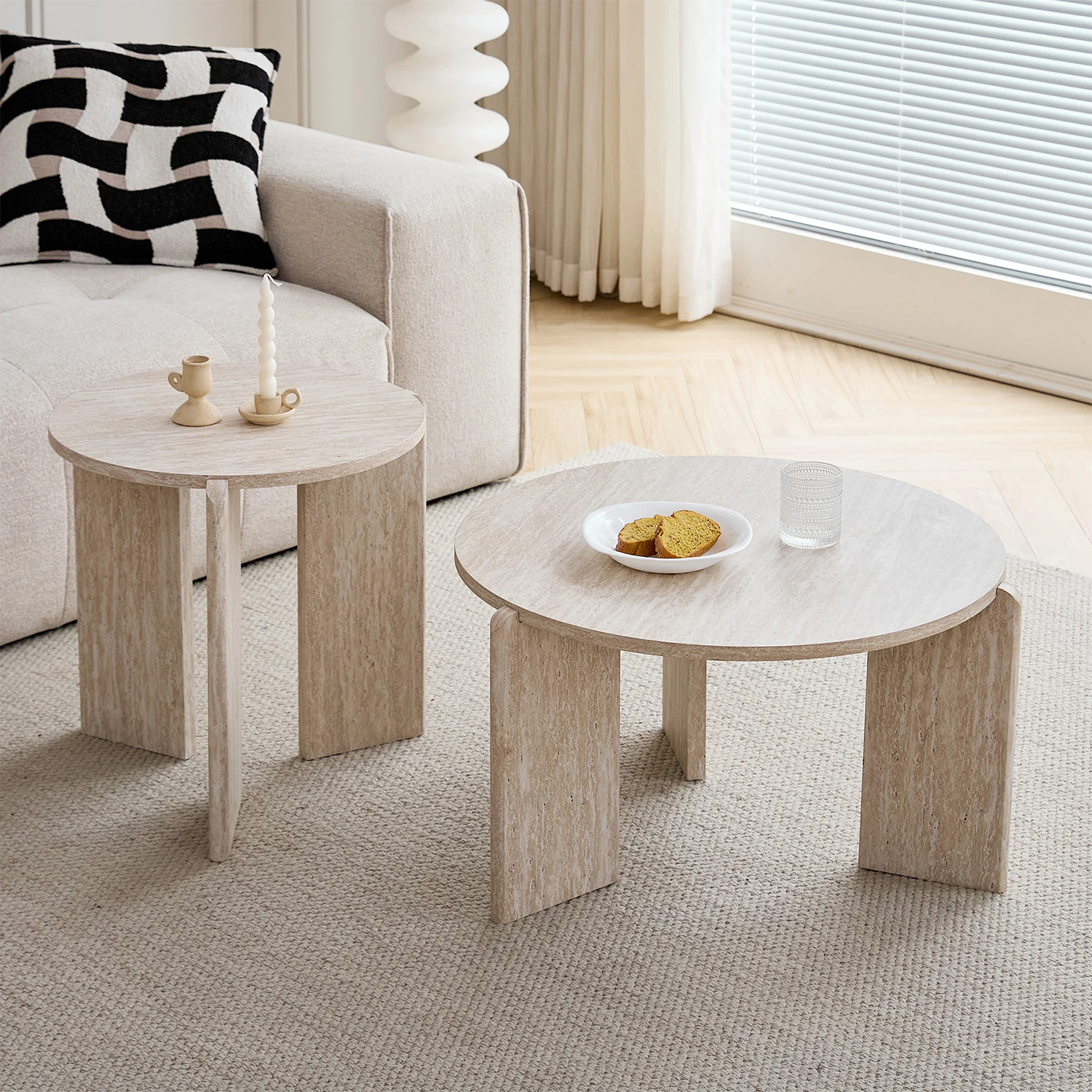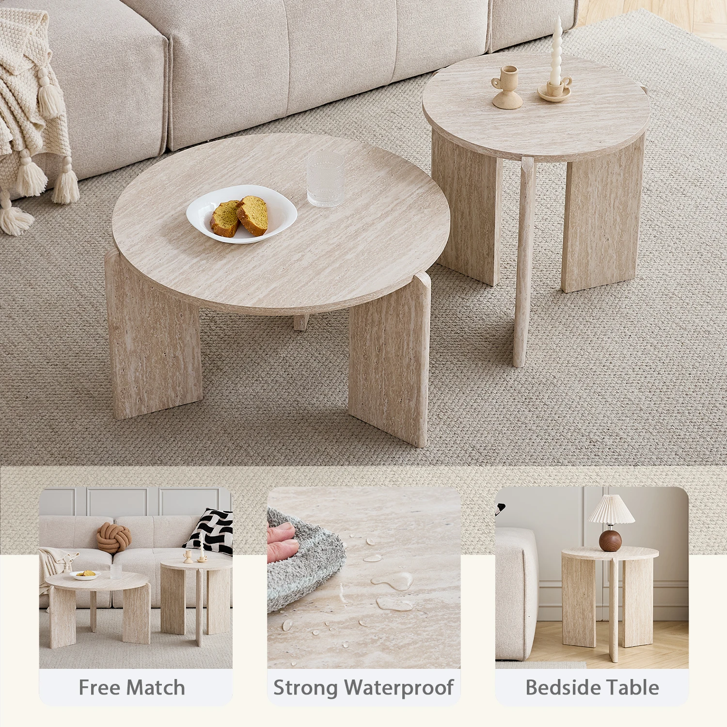Add style to your living space with this set of two minimalist round coffee tables. Crafted from high-quality MDF and covered with a faux wood grain sticker, these coffee tables bring a natural warmth and modern elegance to any room. The larger coffee table, with its spacious surface, is perfect for coffee, books, or decorative items. The smaller coffee table can be used as a side table or partially nestled underneath the larger coffee table for space-saving convenience. Whether you're enjoying a quiet afternoon or entertaining guests, these coffee tables perfectly blend functionality and stylish design.