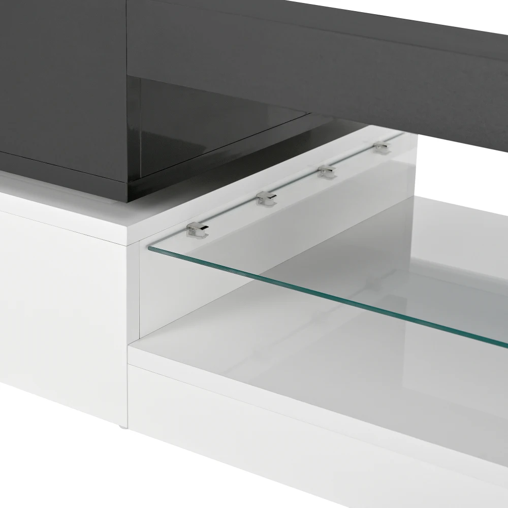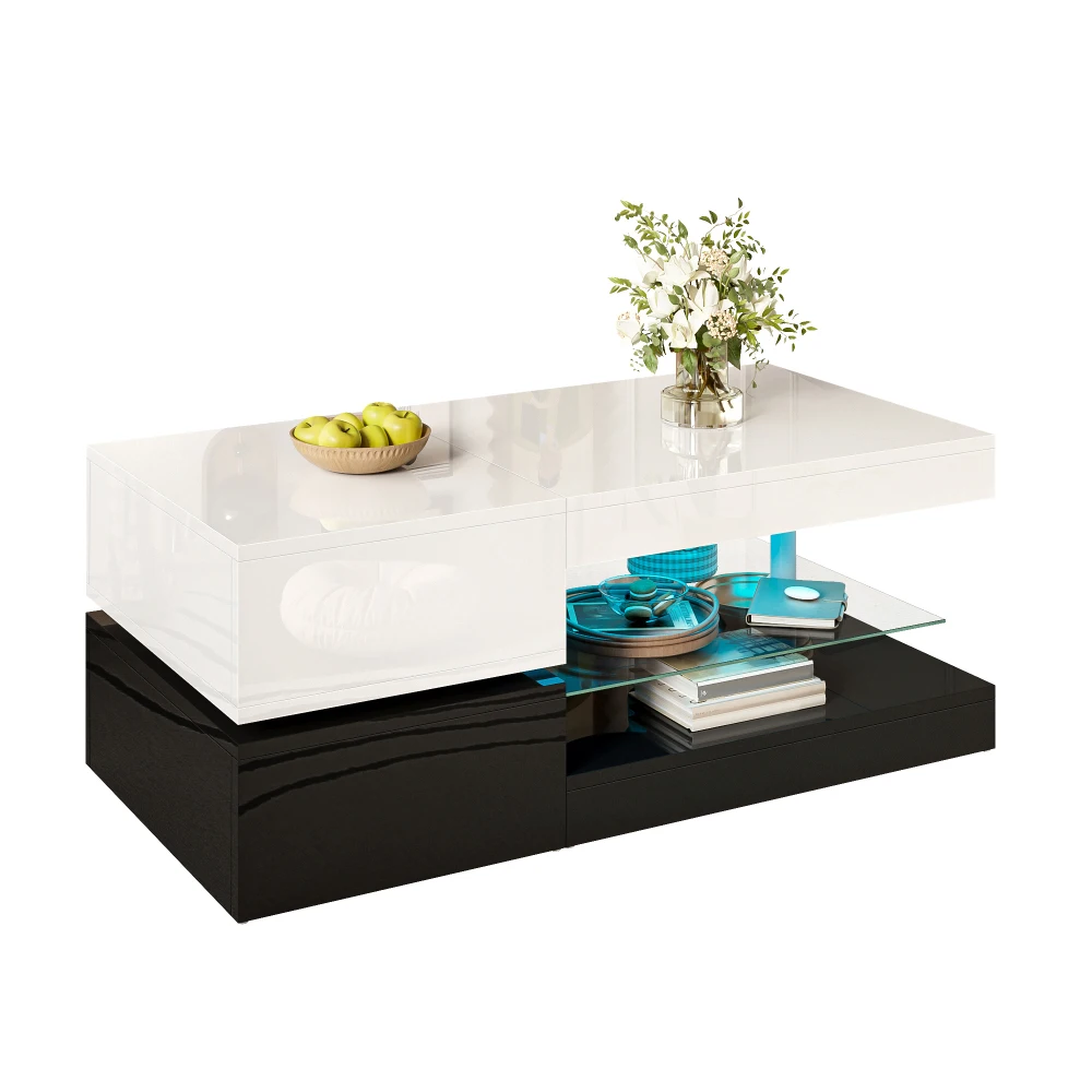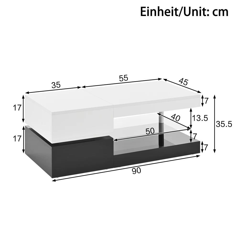 Experience a perfect combination of modern design, functionality and smart technology with our coffee table with LED ambient lighting. The stylish black and white contrast design with a high-gloss white top, a shiny black bottom and a cylindrical stand creates a three-dimensional and airy look that is perfect for modern, fits minimalist and luxurious interior styles. The absolute highlight is the integrated LED light bar with APP and Bluetooth control. Choose from 16 colors and dynamic modes, to create the perfect mood at any time – warm yellow for cozy movie evenings or pulsating rainbow colors for sociable parties. Thanks to its high-gloss coating, it is scratch-resistant, water-repellent and easy to clean. Whether as an optical highlight in front of the sofa, as a practical shelf or as an atmospheric stage for social rounds – this coffee table is a versatile all-rounder, which enhances your living space and creates a special atmosphere.