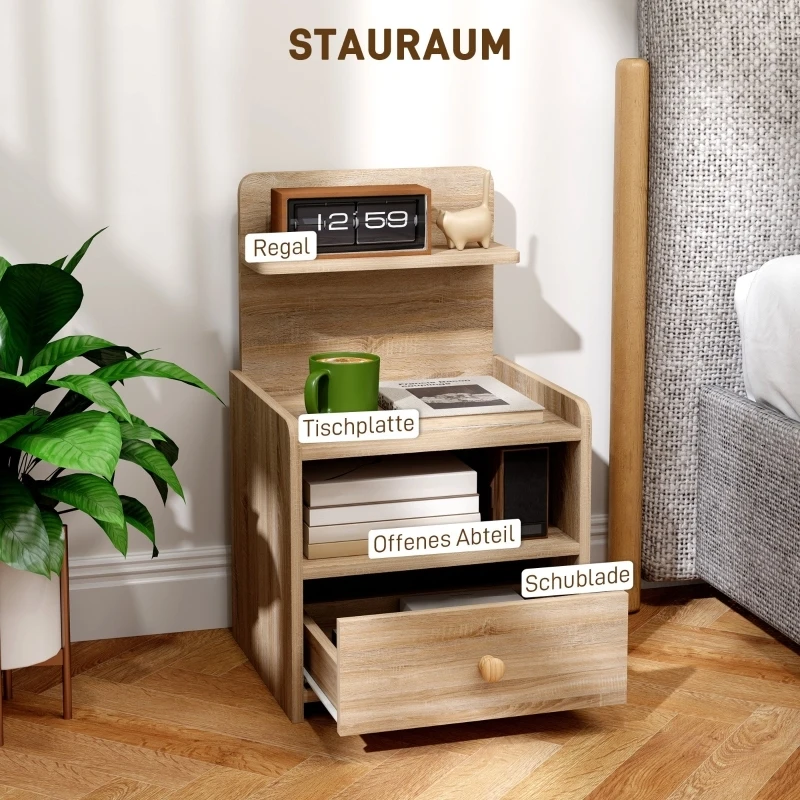 2. Versatile storage solution: Equipped with a useful drawer, a spacious compartment, and an open area, this nightstand with tabletop and side panels keeps your most important items within easy reach.