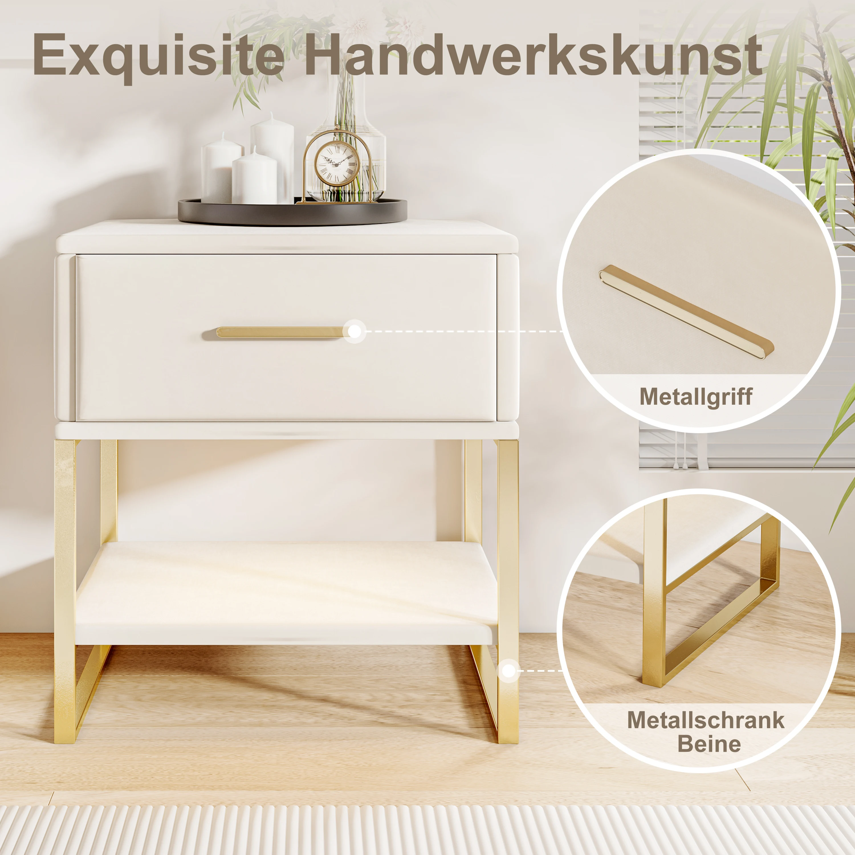 Elegant modern design; this bedside table combines modern style with 1 drawer, elegant straight lines and stylish edges, white wooden floorboards and gold frame for a modern look, adds elegance to your home.