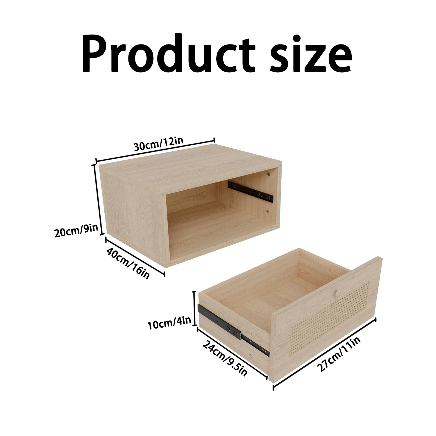 Single Drawer with Smooth Gliding: This wall-mounted bedside cabinet features a generously sized single drawer, offering ample space for books, glasses, or nighttime essentials. Engineered with premium sliding mechanisms, the drawer opens and closes effortlessly - no jamming or wobbling. The clean, handle-free design maintains a minimalist look while providing quick access to your items. Perfect for keeping your bedroom tidy and functional.Wood Material: Crafted from premium wood with a natural color, this floating bedside table complements any decor. The wood grain adds organic texture to your space, creating a cozy yet refined atmosphere. Its versatile design pairs effortlessly with neutral or bold color schemes, making it a timeless addition to your bedroom, dorm, or studio apartment.Display & Storage: The flat, sturdy top accommodates lamps, photo frames, alarm clocks, or decorative accents. It provides just enough space for essentials while keeping your bedside within reach. The smooth surface is easy to wipe clean, ensuring practicality meets style.Space-Saving Wall Mount: Free up floor space with this sleek floating design! The bedside desk mounts securely to the wall (hardware included) with simple installation. Its sturdy brackets ensure stability, even with heavier items inside. Ideal for small bedrooms, studio apartments, or tight spaces where every inch counts. A clutter-free solution that elevates your room’s layout.Bedside table with LED light: The LED light has variable RGB colours, so you can choose the light and the mode according to your needs and the scene. It can be controlled manually by pressing the buttons, or with the remote control or mobile app, which is both fun and convenient.adds a warm glow - perfect for nighttime reading or creating a relaxing atmosphere. Energy-efficient and low-heat, the light is discreetly embedded for a seamless look.Specifications: